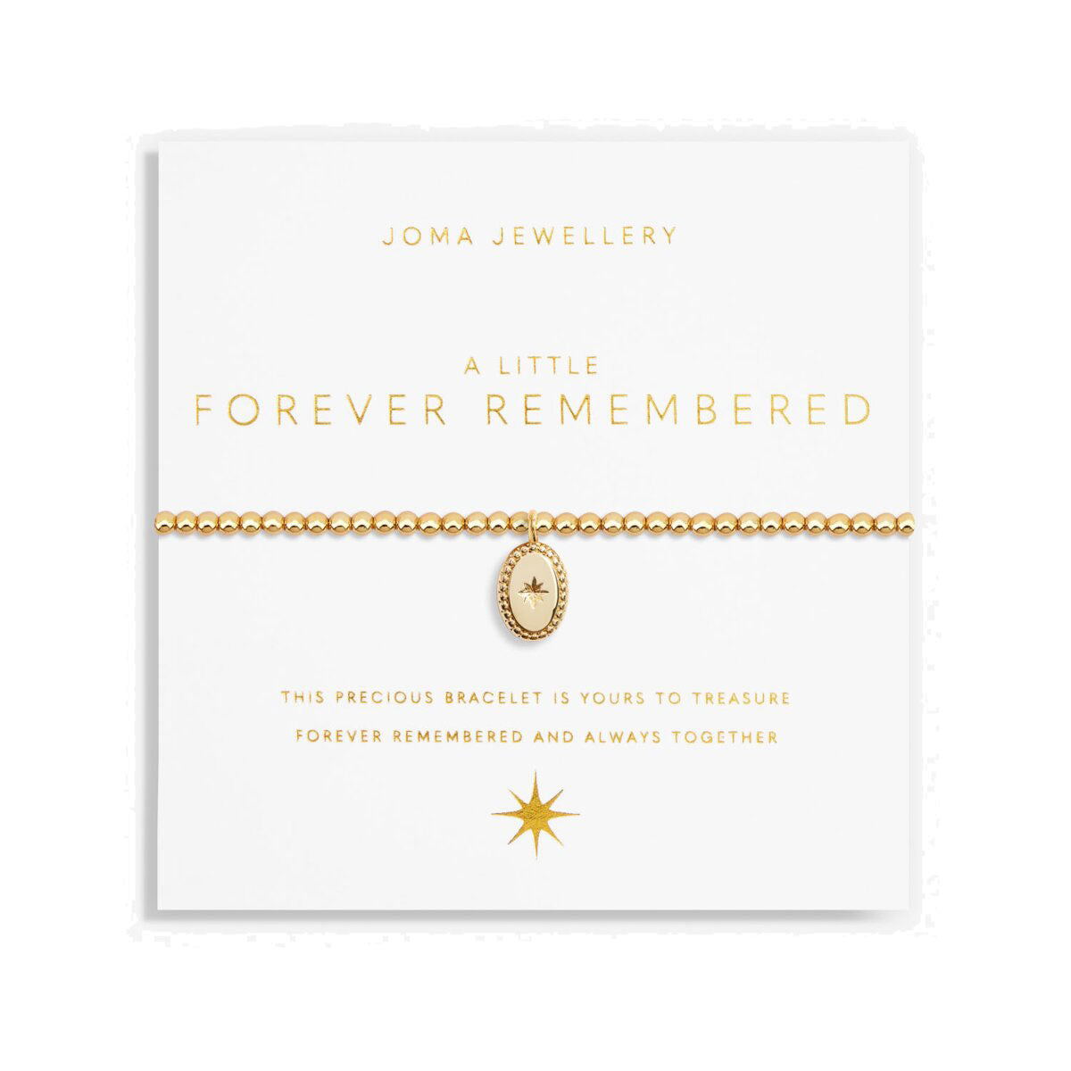 Embrace everlasting memories with our Joma Jewellery A Little 'Forever Remembered' Bracelet. Crafted with a captivating stretch design and adorned with a precious gold-plated oval star charm, this bracelet is a beautiful tribute to cherished moments.