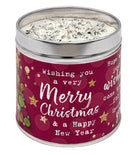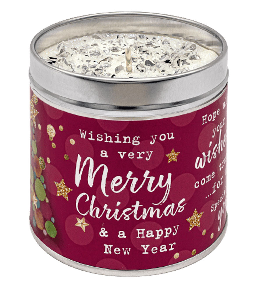 Introducing the "Wishing You a Very Merry Christmas and Happy New Year" Candle Tin by Best Kept Secrets – a radiant gift to brighten up the holiday season.