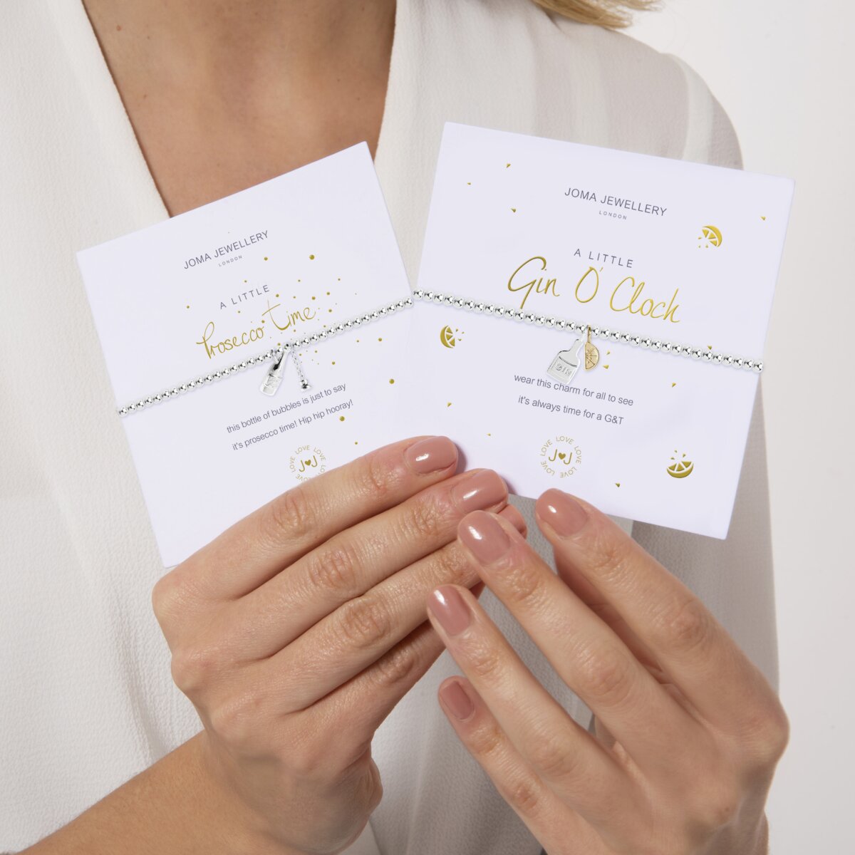 Silver Gin Bottle and Gold Lemon Slice charm, on a stretchy beaded Joma bracelet.