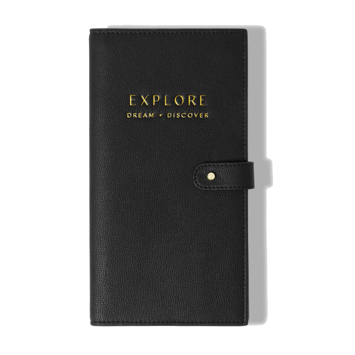 Embossed with the inspiring words “Explore, Dream, Discover”, this sleek passport holder is your perfect travel companion. Crafted from premium vegan leather, it offers two practical sections to keep your passport and essential documents secure and stylishly organised. The gold-tone press stud fastening adds a luxurious finish, while the slimline design slips effortlessly into your bag.