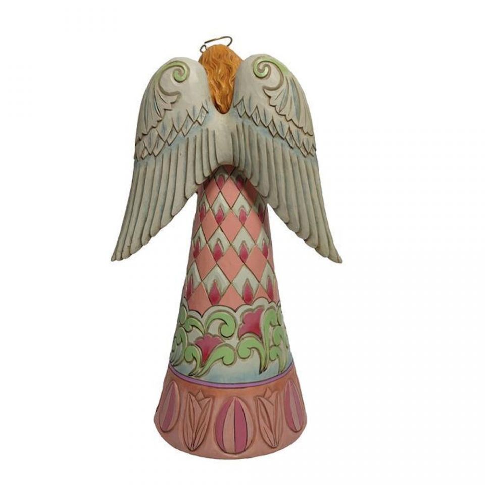 With an armful of Easter lilies, this brightly gowned angel blesses your home this Spring with grace and love. With a dress patterned in flowers and cheery colors, she admires a dove and reflects on the great blessings the Lord delivered on Easter.