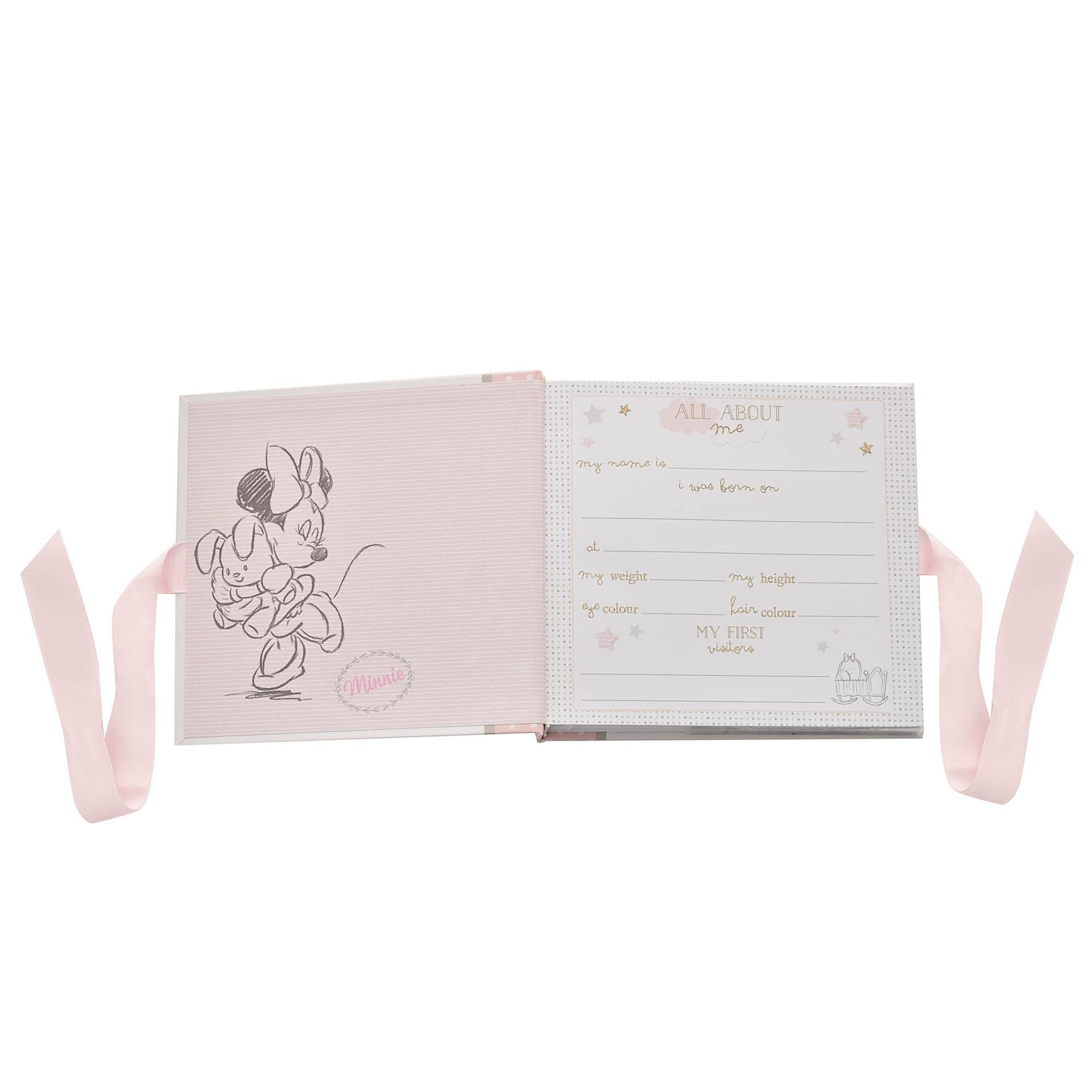 The album displays a beautifully printed image of Minnie Mouse, complete with ‘Gorgeous baby girl' sentiment in gold glitter lettering on the front cover. It holds space for fifty photographs, features a completable title page and is finished with a pink satin bow closure.