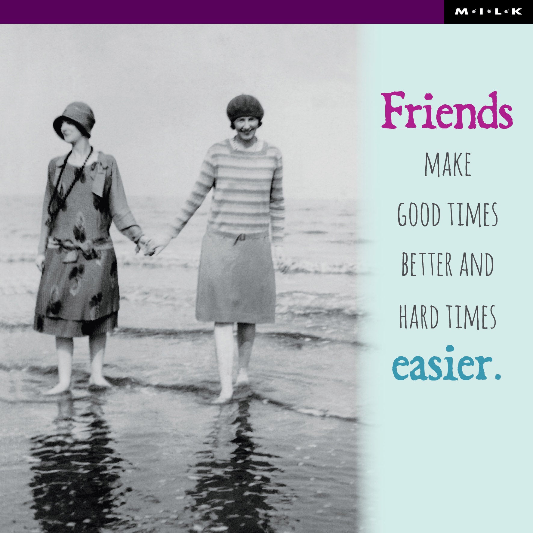 Featuring the touching message “Friends make good times better and hard times easier” and a nostalgic vintage photo of two women holding hands as they walk along the beach, it beautifully captures the quiet strength and joy of true companionship.