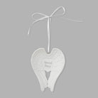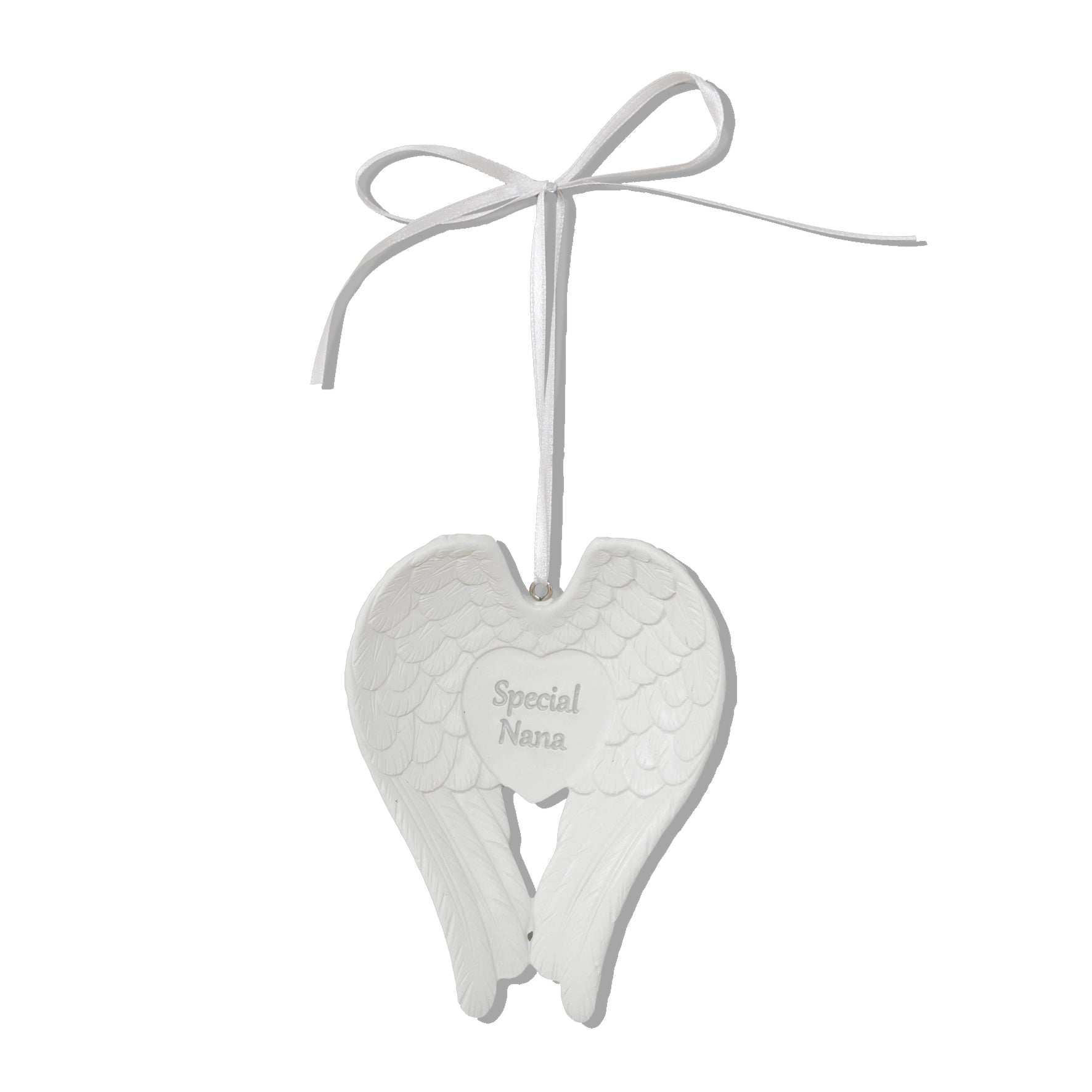 This moulded pair of angel wings features a heart shaped central panel with pastel grey 'Special Nana' title. Complete with a pearl white hanging ribbon, this is an elegant and timeless way to commemorate a lost angel.