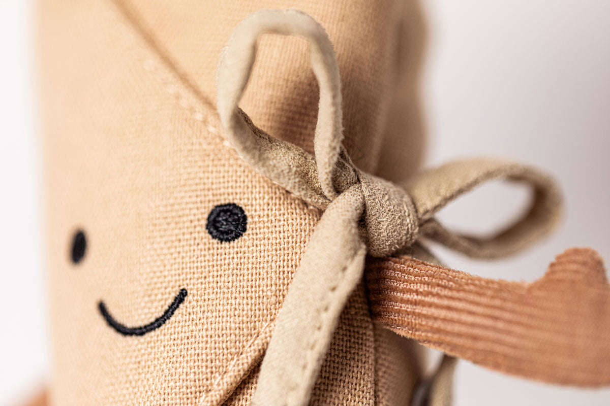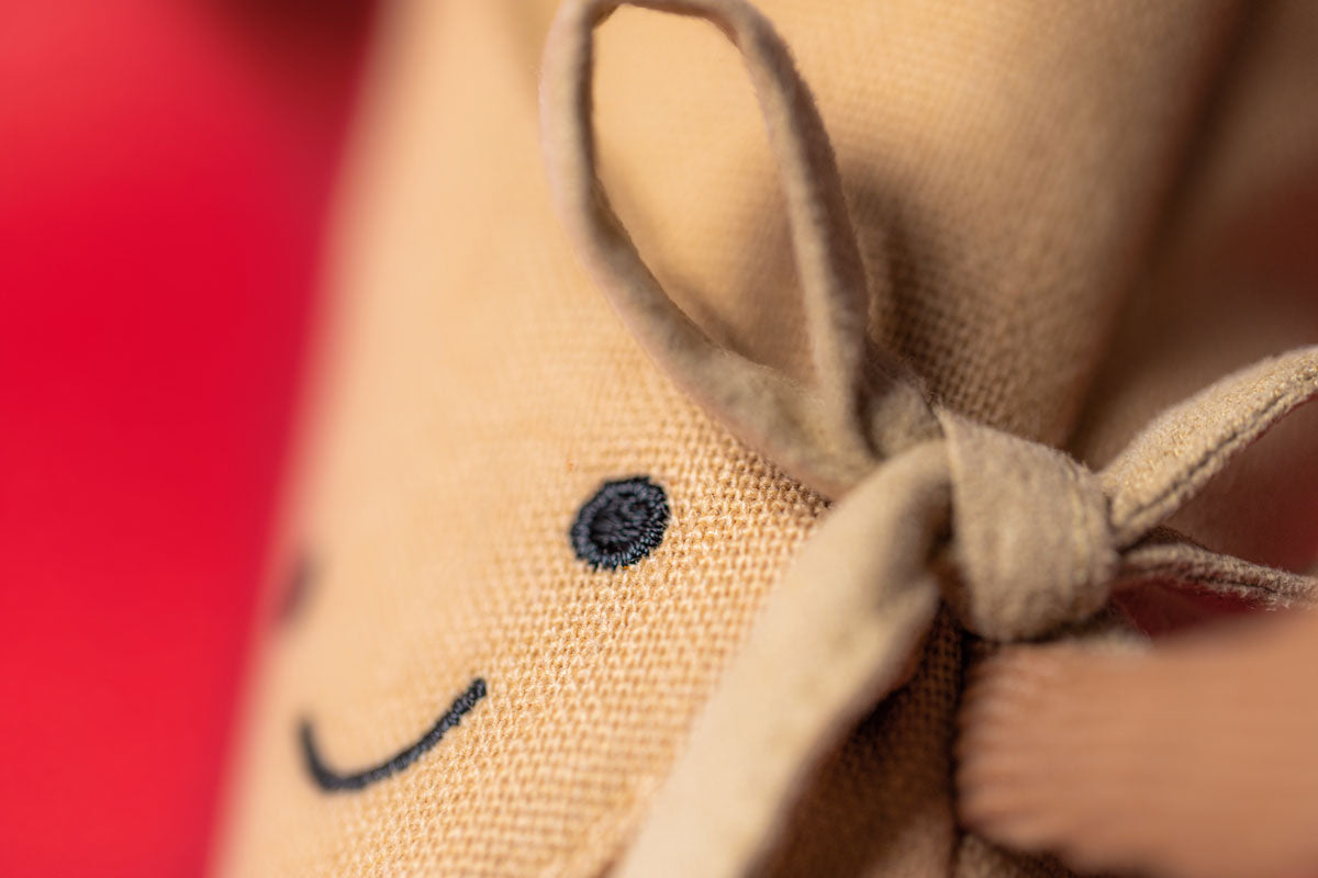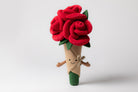 This adorable bouquet features a trio of soft red roses in full bloom, complete with green suedette leaves and detailed stems. Wrapped in beige linen and tied with a charming ribbon, the bouquet comes to life with an embroidered smile and fine cord arms, ready for thorn-free cuddles. A unique and cheerful gift for any occasion!