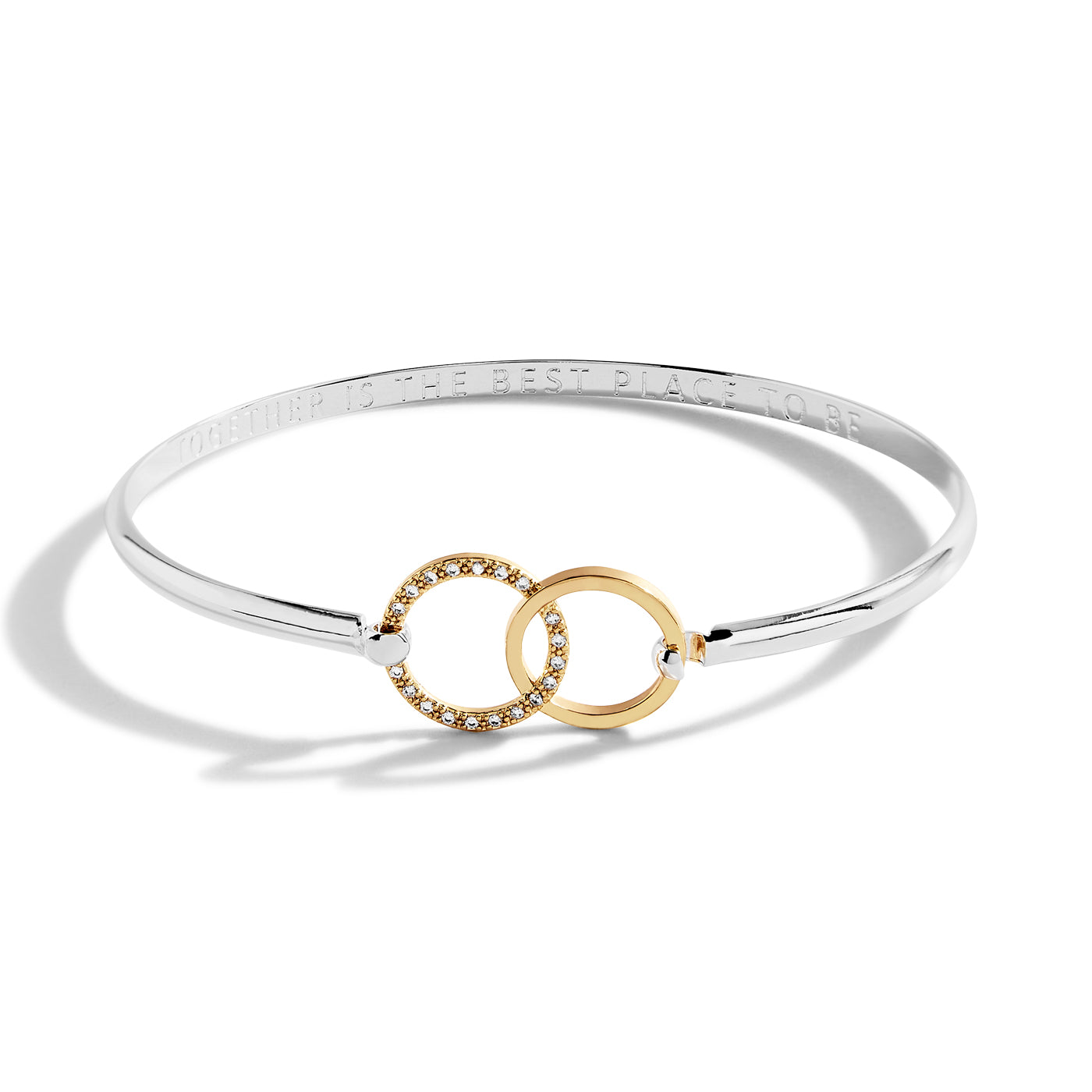 This gorgeous bracelet features a silver-plated bangle adorned with breathtaking circle-shaped charms that are sure to catch the eye. The pavé crystals add an extra touch of glamour to this already-beautiful piece, and the sweet sentiment, "together is the best place to be," engraved on the bangle is the perfect way to commemorate any special occasion.