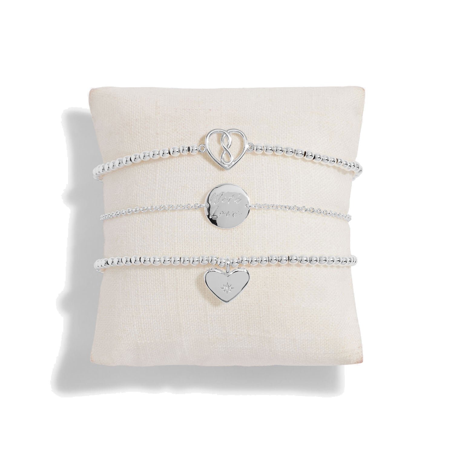 This exquisite gift box is a tribute to the eternal bond between mother and child. Nestled within a luxurious linen cushion, discover three stunning silver-plated bracelets, each adorned with a unique charm. From heartfelt sentiments to timeless elegance, this gift box encapsulates the essence of maternal love.