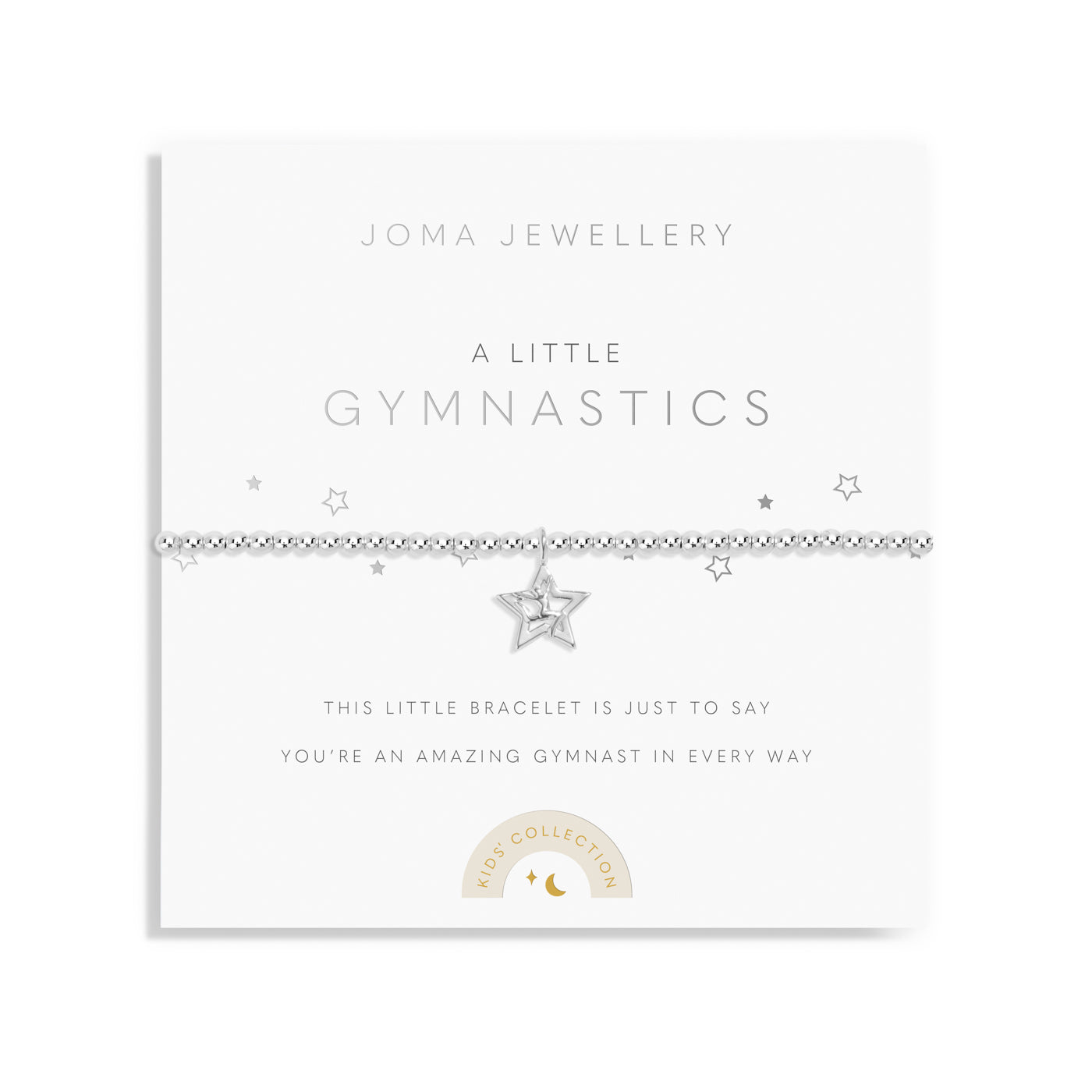 Designed for smaller wrists, this adorable silver-plated bracelet features the brand’s signature beaded stretch design for a comfortable fit. A charming gymnastics star charm adds a special touch, symbolizing dedication and love for the sport. Beautifully presented on a sentiment-stamped card with fun doodles, it’s the perfect keepsake to inspire and encourage every little gymnast.