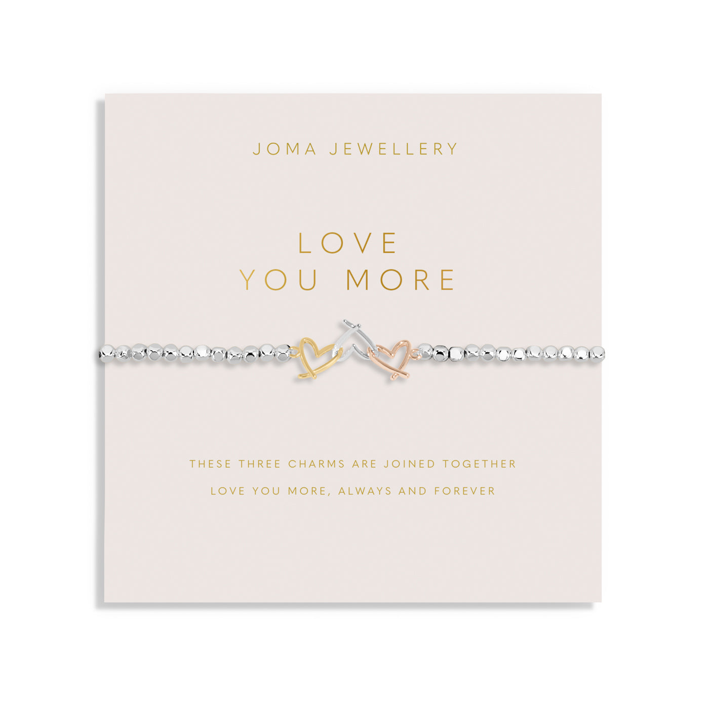 Part of the Forever Yours collection, this stunning bracelet features a silver-plated hammered bead design, complemented by three interlinked heart charms in silver, gold, and rose gold plating—symbolizing deep and everlasting love. Presented on a sentiment-stamped card with a heartfelt poem, it’s the perfect gift to celebrate someone special.