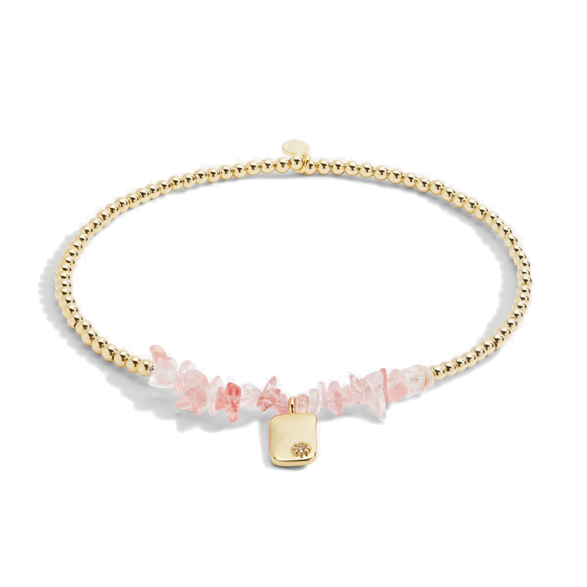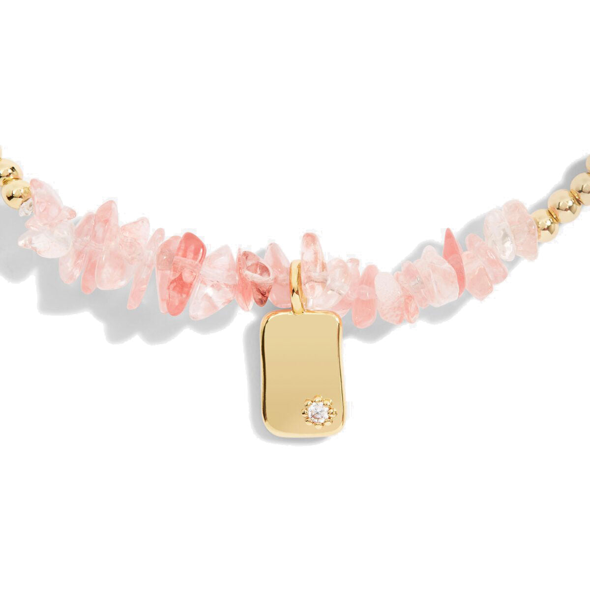 - Design: Gold beads with raw-cut pink crystals and a pavé-accented tablet charm