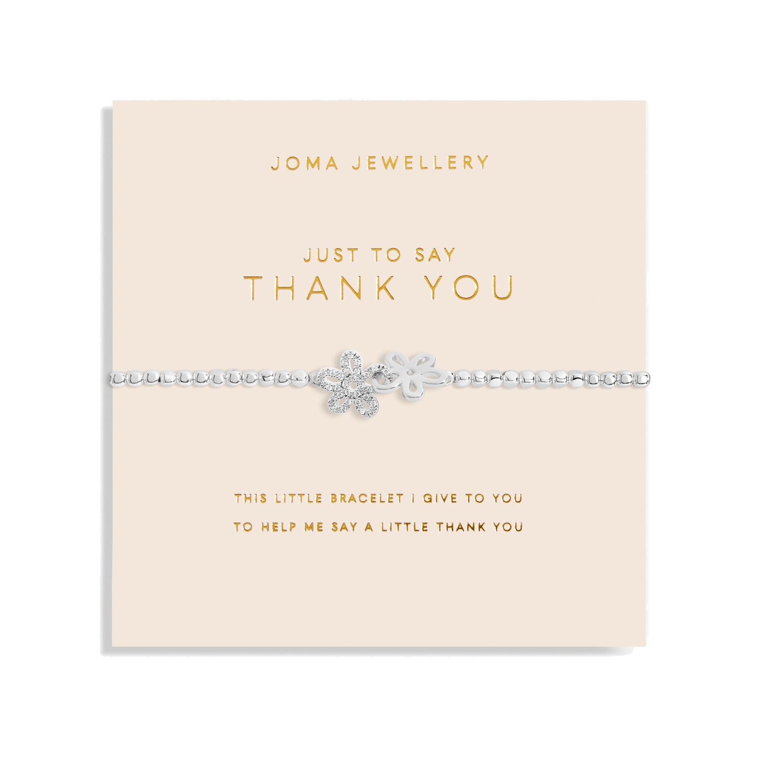 Discover our Forever Yours Collection, made to be treasured for a lifetime. This beautiful bracelet features a silver-plated design with a flower-shaped charm and sparkling pavé crystals. Complete with a pretty blush pink card which has been stamped with the sentiment 'Just To Say Thank You' and a sweet poem. Perfect for celebrating every special occasion.