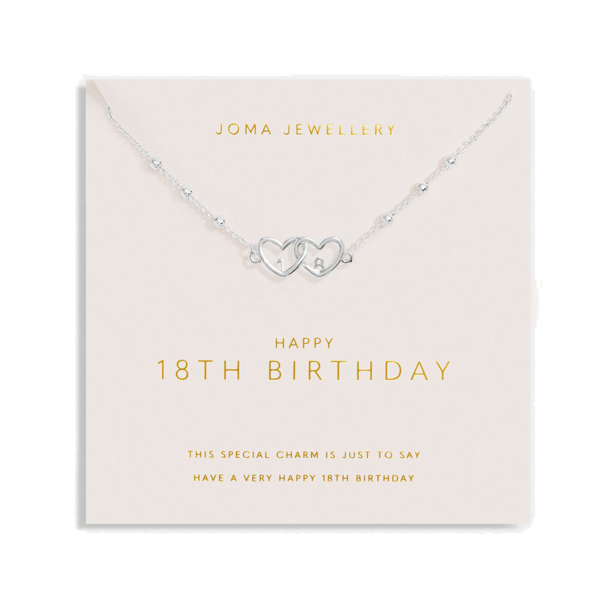 This beautifully crafted necklace features a shining silver-plated spacer bead chain and two interlocked heart charms, symbolising love and best wishes for the birthday girl. Presented on a blush card with a sweet birthday message, it’s the perfect keepsake for this special occasion. With a 46cm chain and 5cm extender, this necklace is designed to be treasured for a lifetime—a meaningful gift that beautifully marks the start of adulthood.