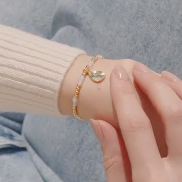 The bracelet features enchanting semi-precious moonstone gemstones that exude a unique radiance. Its stretch-bead design ensures a perfect fit on every wrist, providing both comfort and style. The exquisite gold-plated charm adds a touch of elegance, making it an ideal accessory for any occasion.