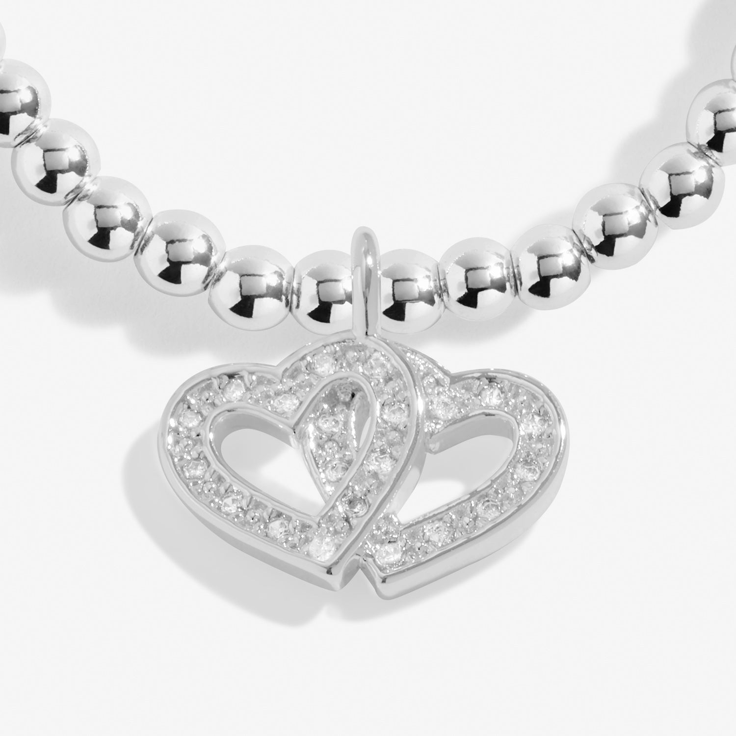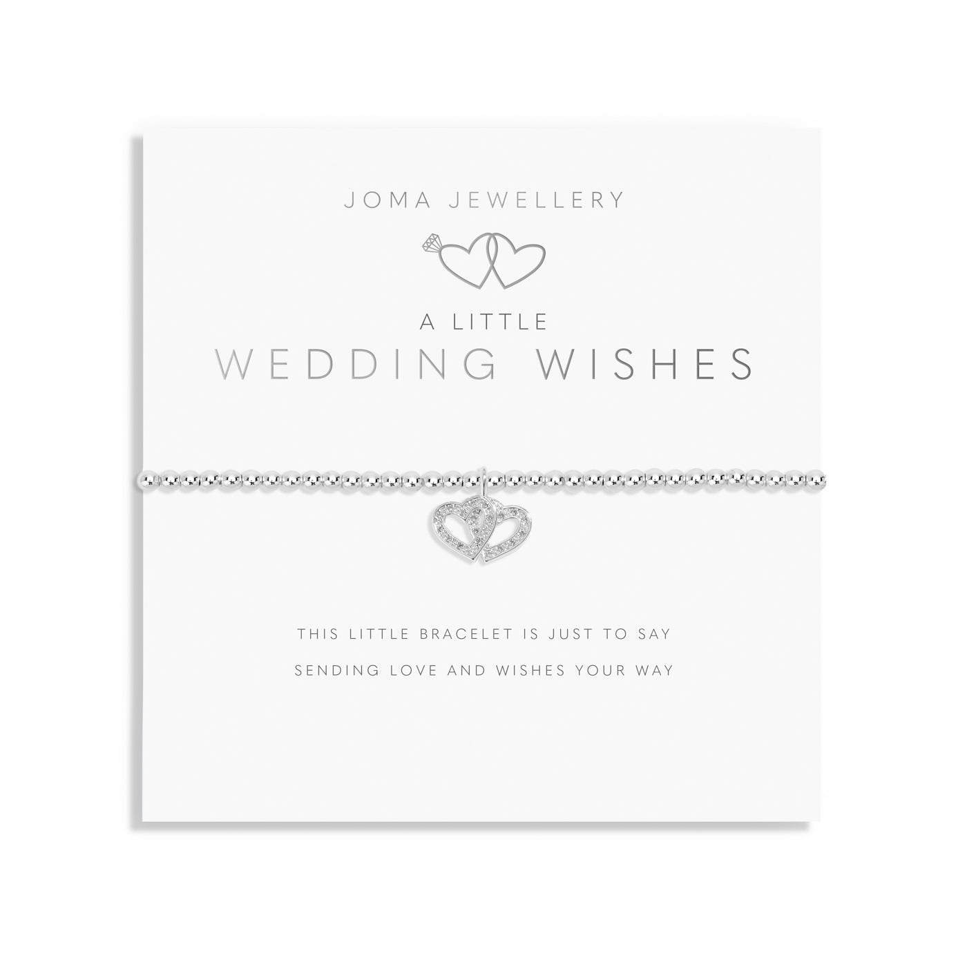 Designed with Joma's signature beaded stretch fit, this silver-plated bracelet is adorned with a delicate linked hearts charm featuring pavé detailing, symbolizing the unbreakable bond of the happy couple. Beautifully presented on a sentiment-stamped card with the loving message: