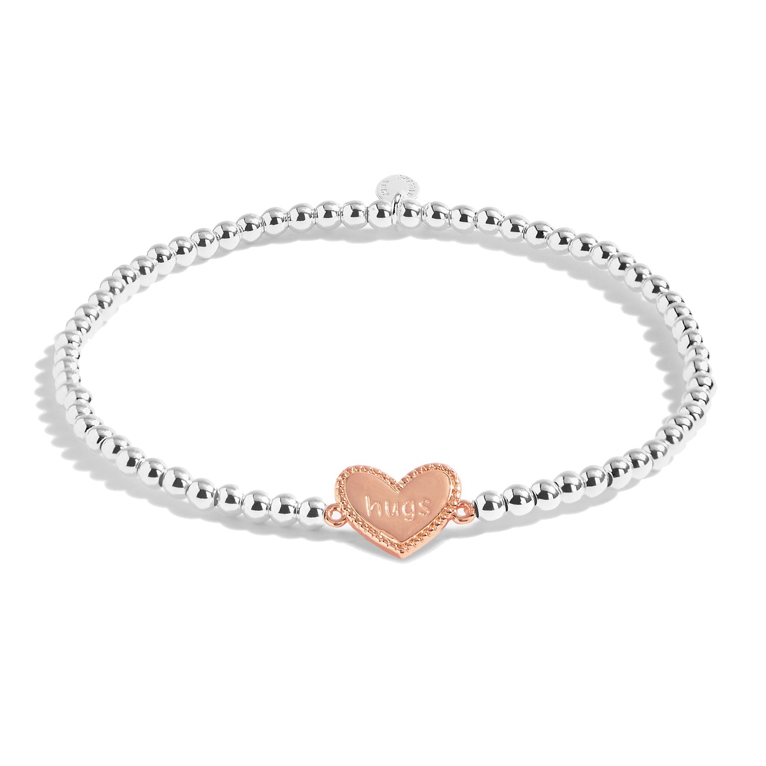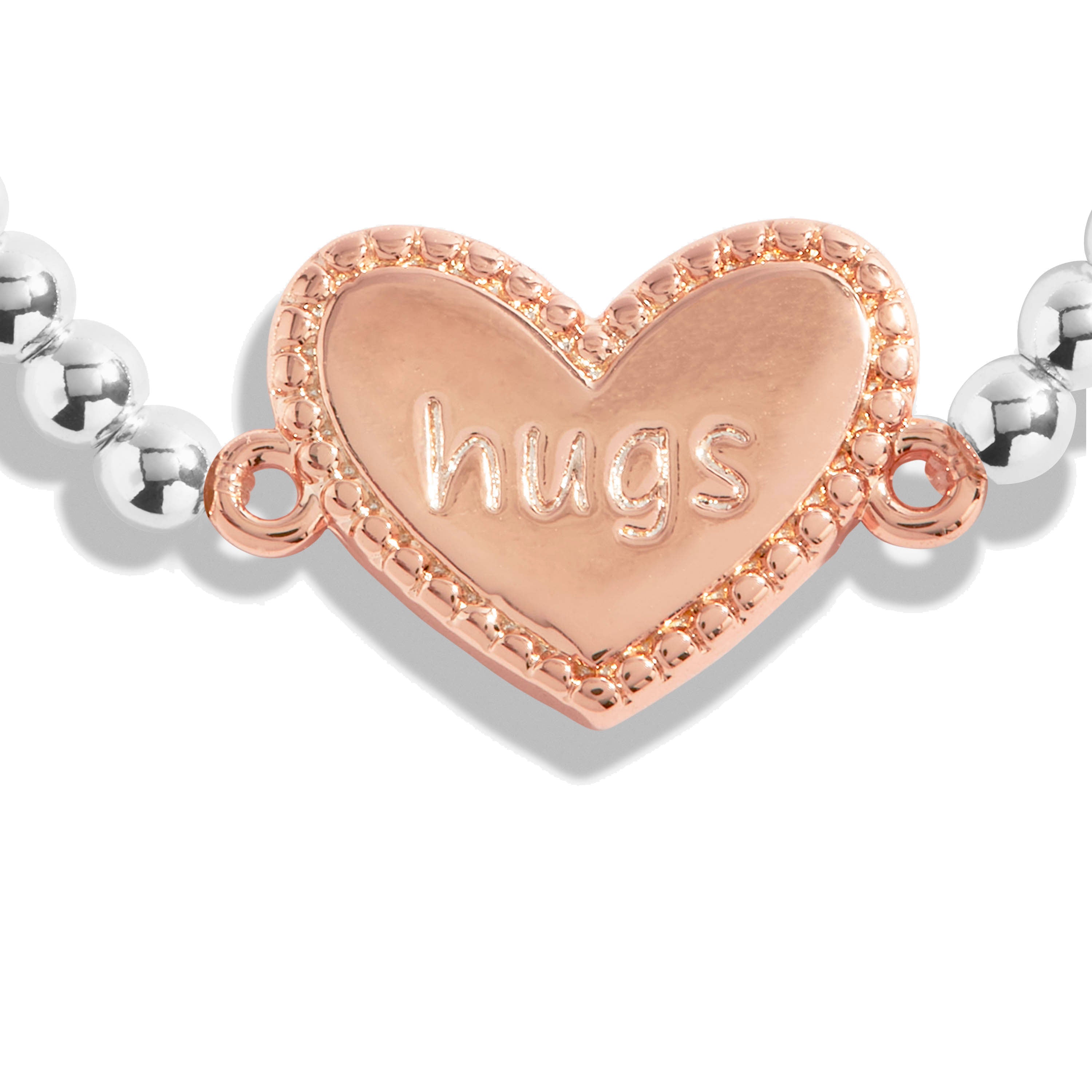 Silver plated bead stretch bracelet, designed with Hugs engraved on the rose gold heart charm, that is sure to bring a smile to her face, this piece is sure to be a cherished gift for many years to come.