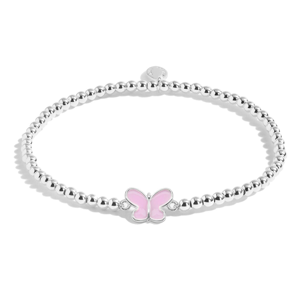 Encased in a charming heart-shaped box, this silver-plated bracelet is a petite masterpiece designed for smaller wrists. The stretchable silver-plated brass bracelet is adorned with a delicate butterfly charm, creating a whimsical touch to every little one's wrist.