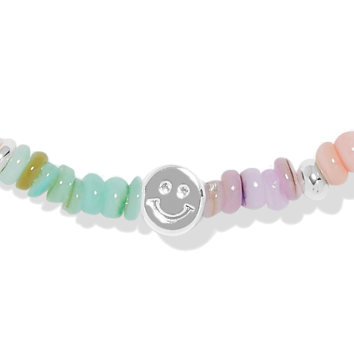 Part of the cheerful Happy Little Moments Collection, this bracelet is designed with multicoloured natural shells, alphabet beads, and sparkling charms. Perfect for stacking and celebrating special moments, it comes beautifully displayed on a starburst-print presentation card reading "Always be happy and smile" and includes a blush pink hanging ribbon.