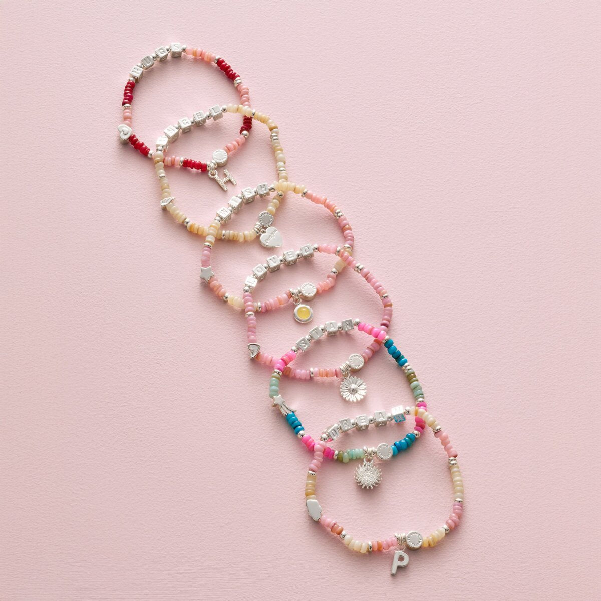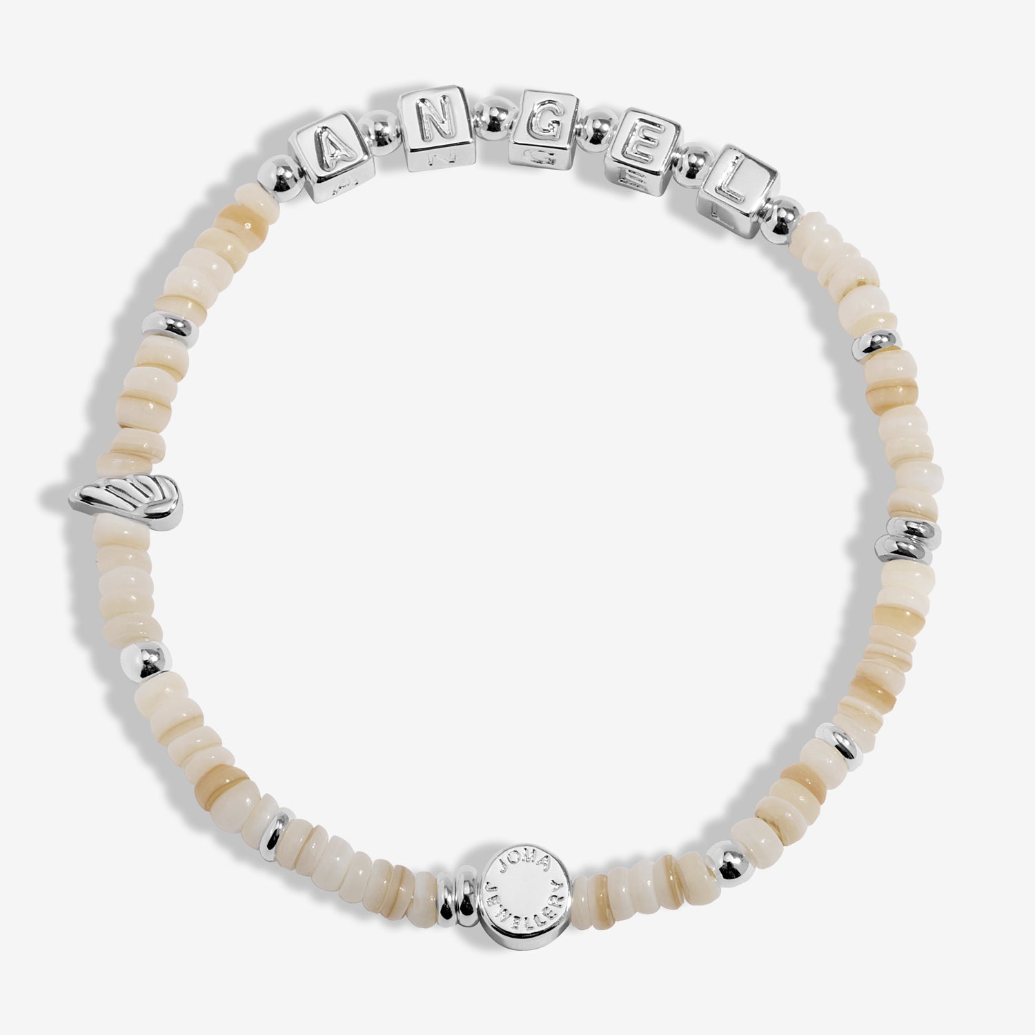 Perfectly proportioned for smaller wrists, this whimsical piece features a blend of multicoloured natural shells and shimmering silver-plated beads. Adorned with delicate alphabet beads and a twinkling angel charm, it serves as a sweet, wearable reminder that she is never alone and always protected.