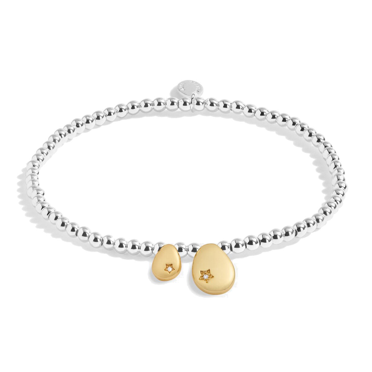 Beautifully presented in a red and buttercream gift box, this bracelet features a charming design with shine-bright beads and two adorable pebble charms in silver and gold plating.