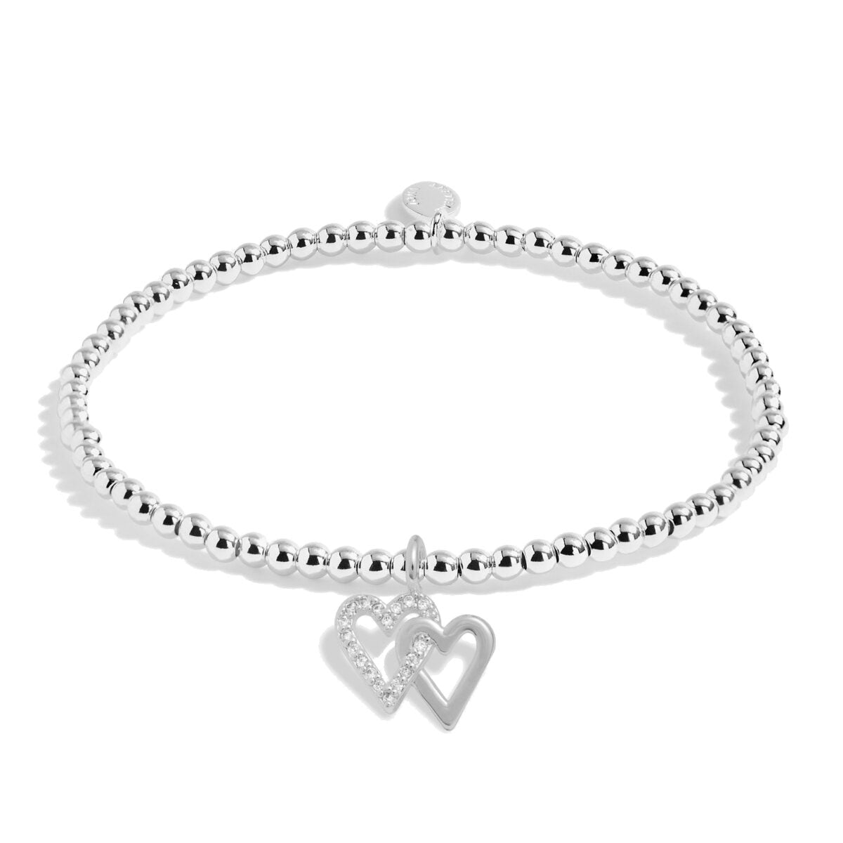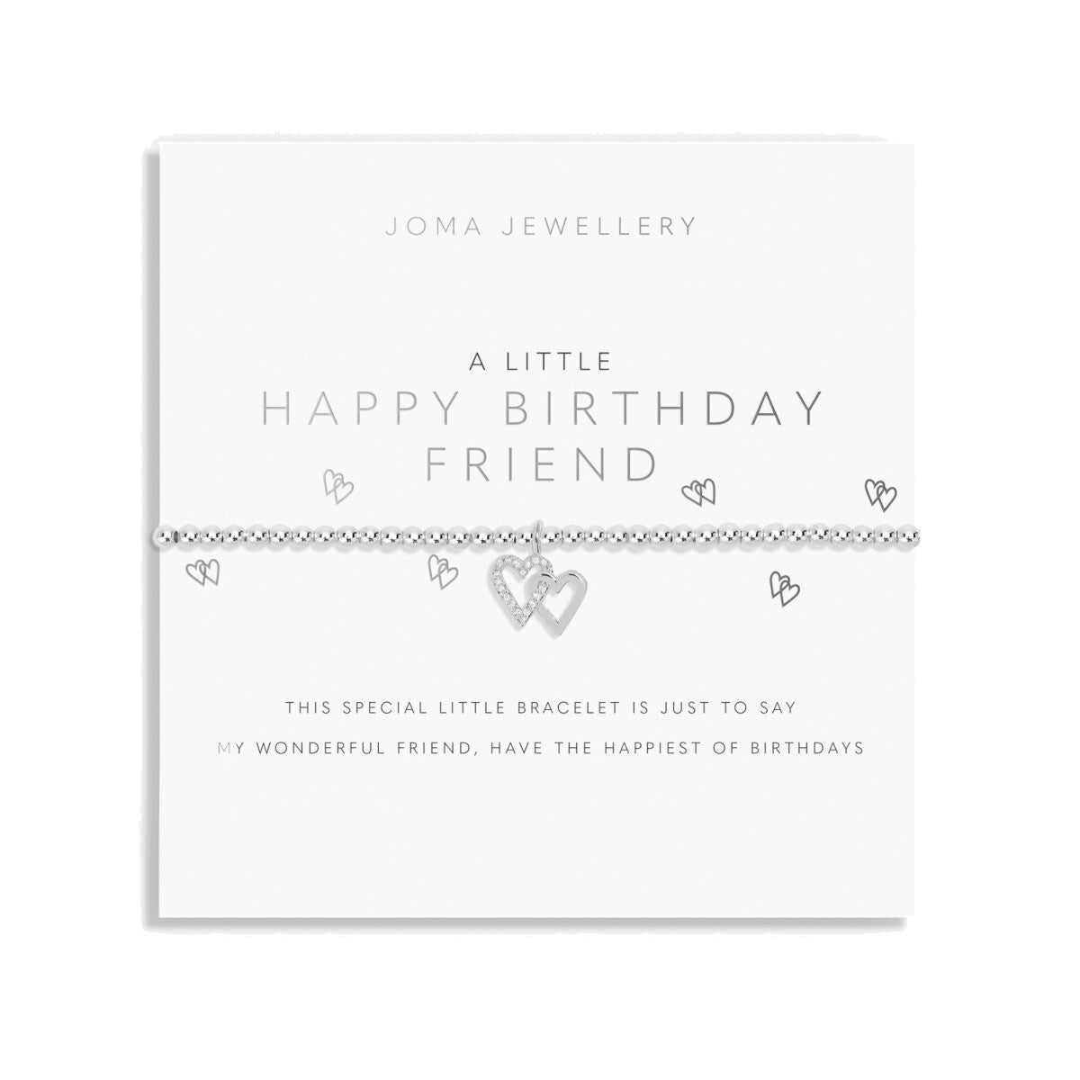 Designed with Joma’s signature beaded style, this bracelet ensures a comfortable fit on any wrist. The elegant silver-plated double heart charm represents the love and bond you share with your friend. Thoughtfully wrapped around a sentiment-stamped card, it’s ready to bring joy and make her birthday unforgettable.