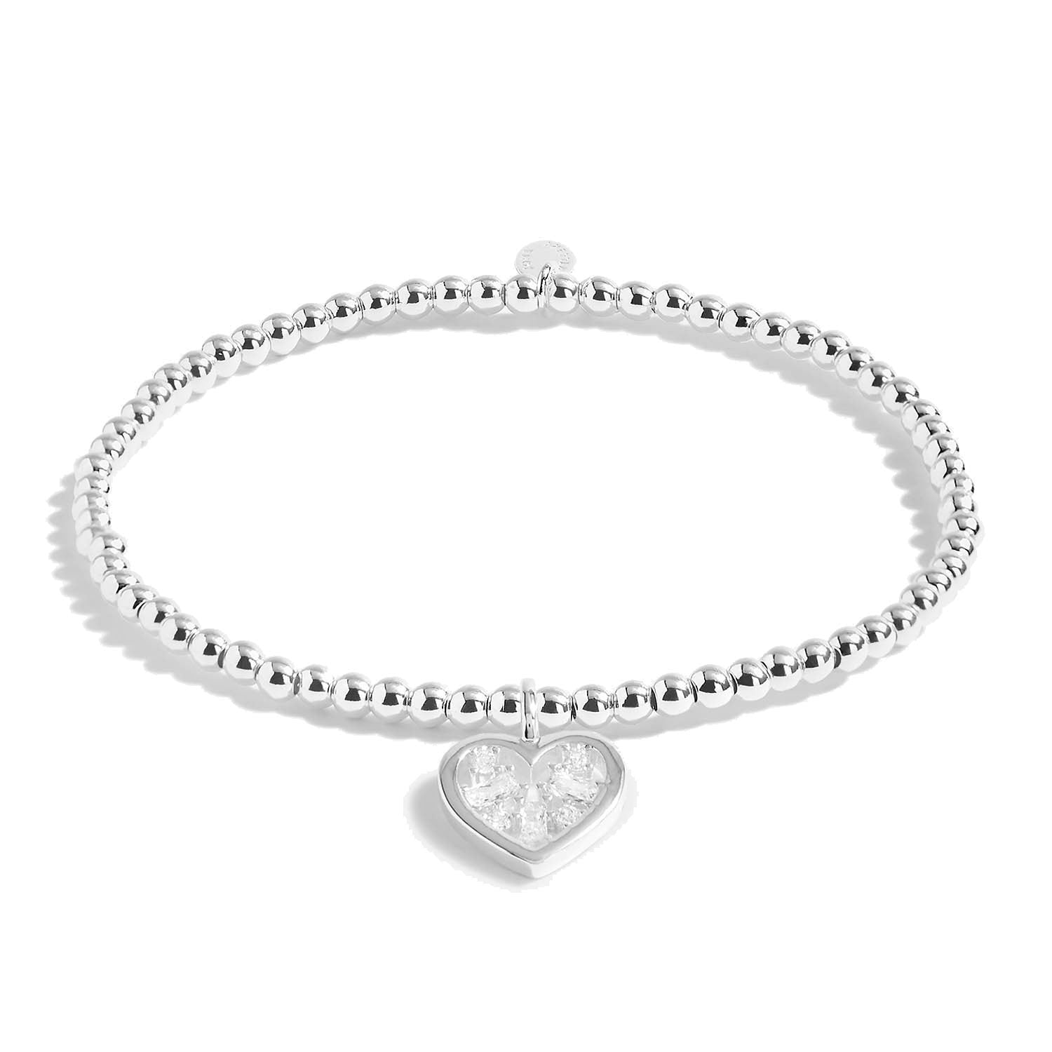 Featuring a sparkling silver heart-shaped charm on a stretch bead bracelet. A wonderful present for any occasion. This charming bracelet will be a reminder of your friendship for years to come.
