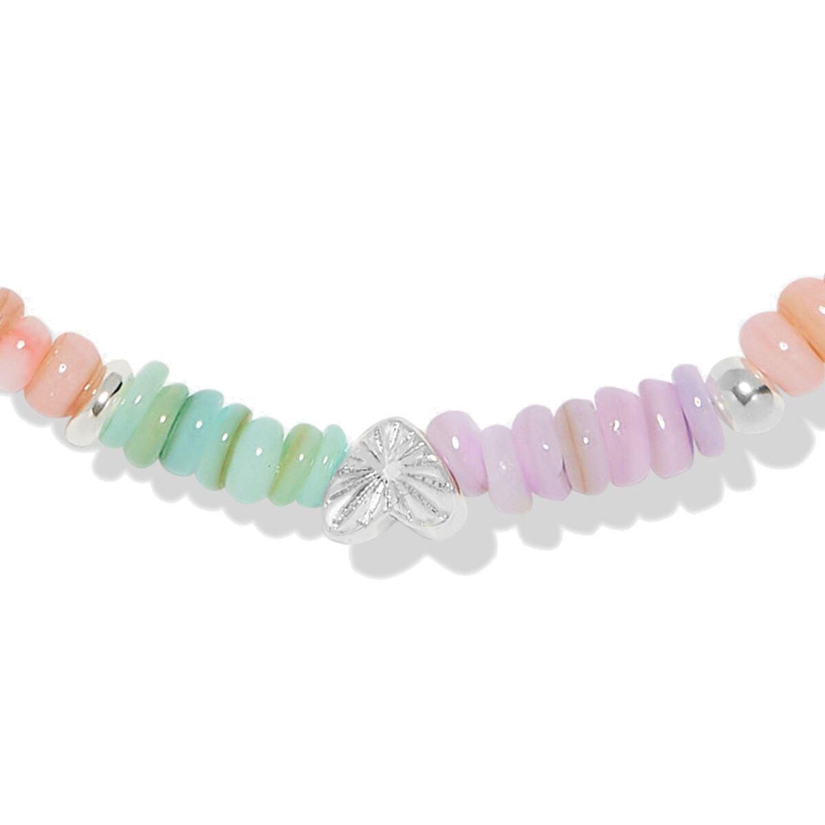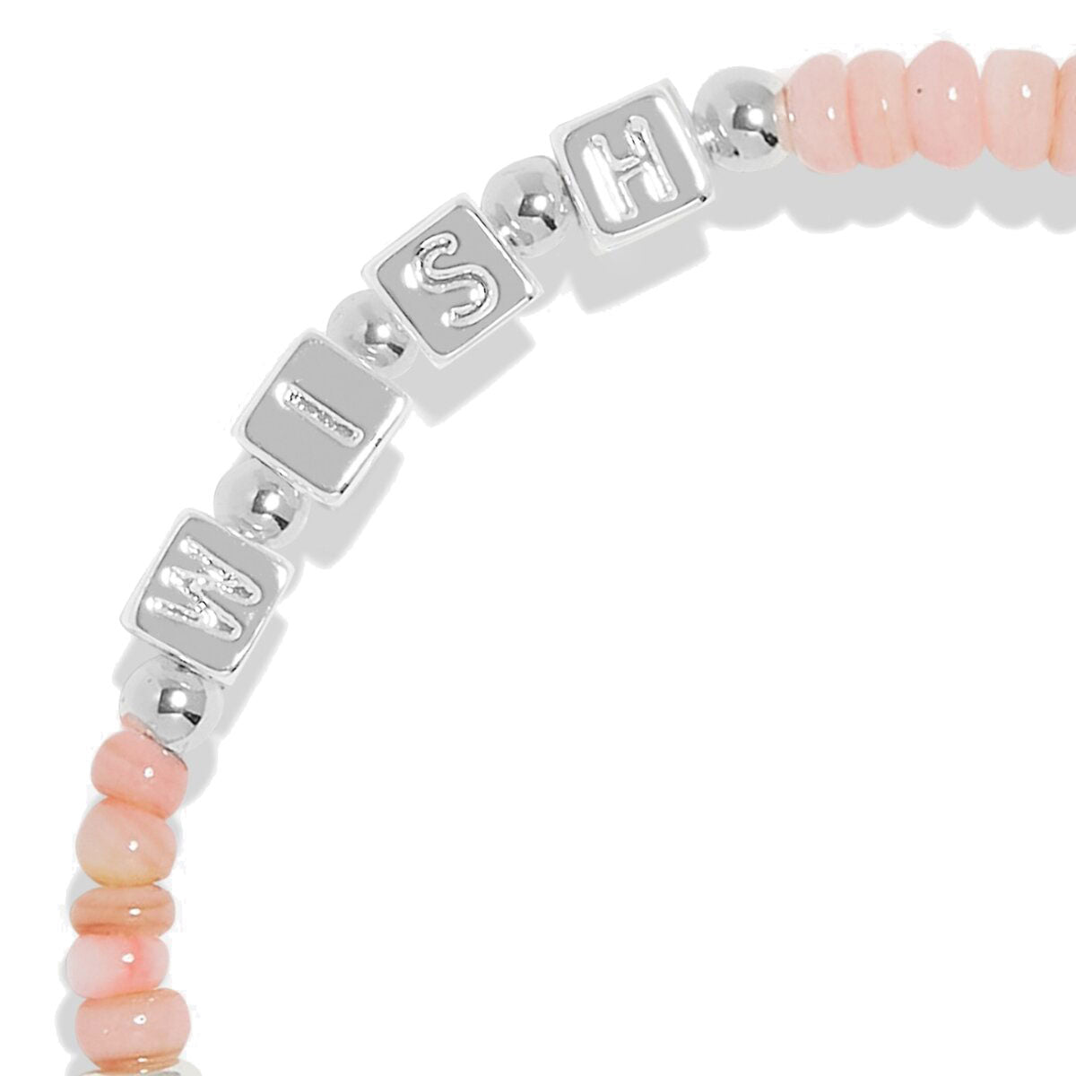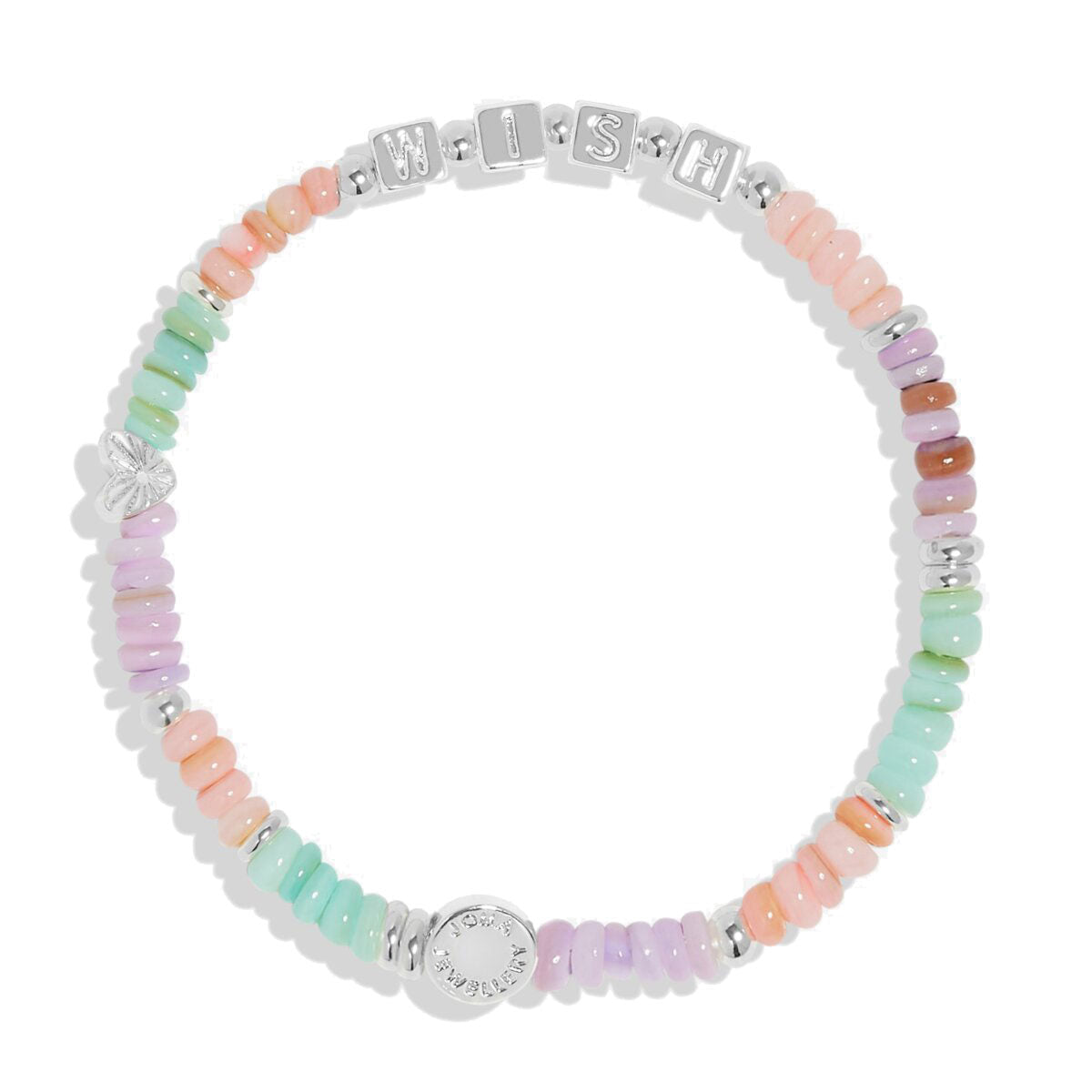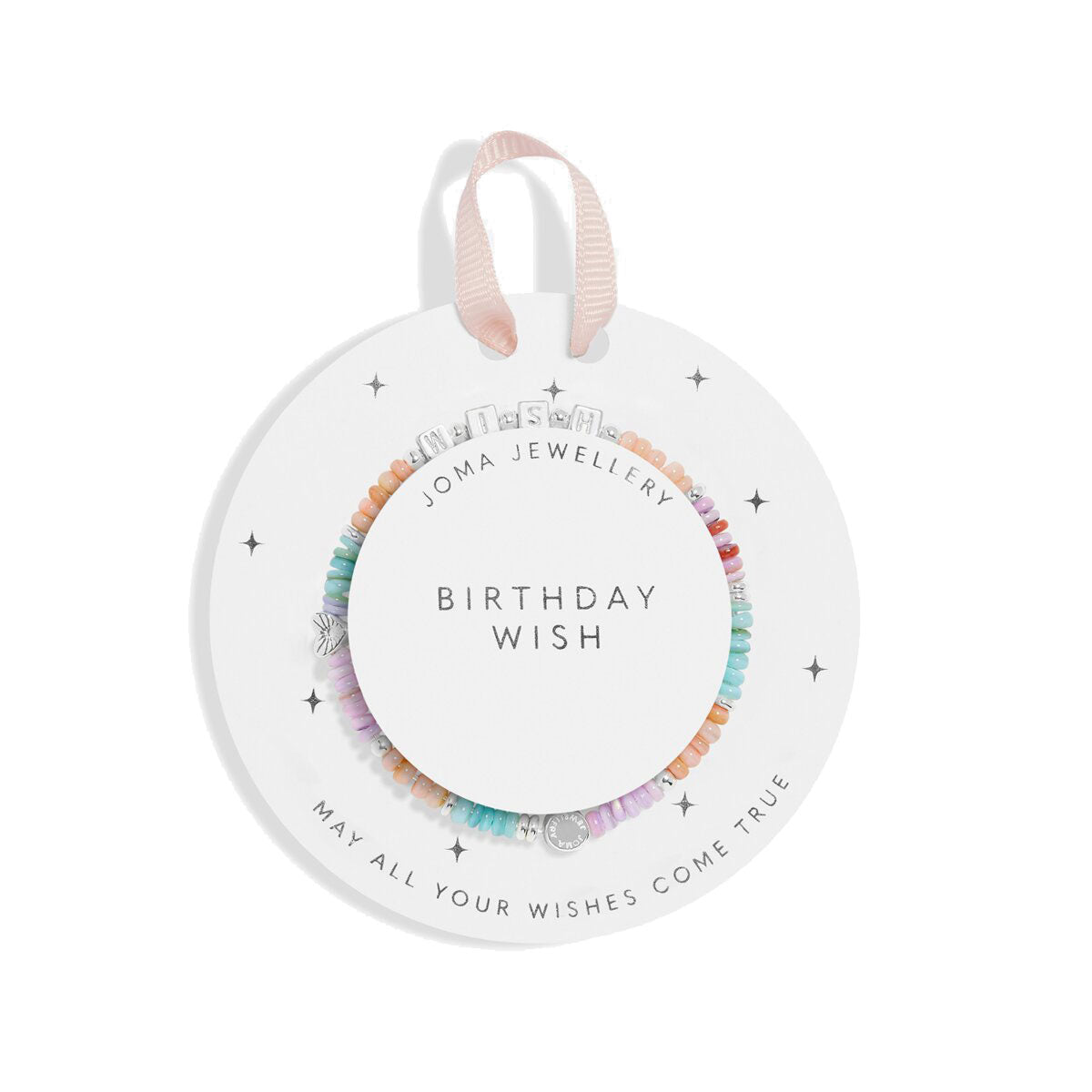 Part of the delightful Happy Little Moments Collection, this bracelet features multicoloured natural shells, alphabet beads, and sparkling charms. Ideal for stacking, it comes displayed on a starburst-print presentation card with the sweet message "May all your wishes come true" and is finished with a blush pink hanging ribbon.