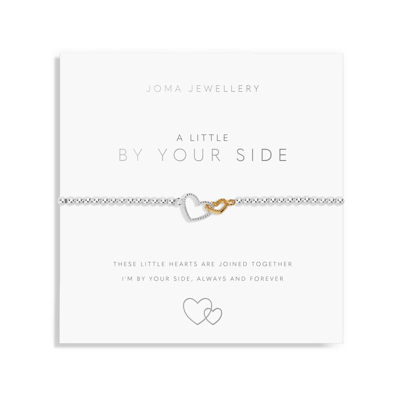 Interlocked gold and silver heart-shaped charms on a stretch bracelet, wrapped around a 'By Your Side' heart printed card and framed by a sweet poem.