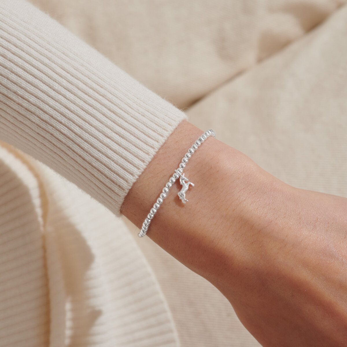 A stretchy 3mm silver ball bracelet with a silver unicorn charm.