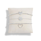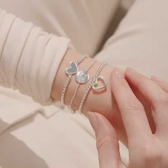 Inside the stylish and thoughtfully crafted box, a plush pillow holds three stunning silver-plated A Little Bracelets. Each bracelet is adorned with its unique charms, adding a touch of elegance and sentiment to every piece. The silver-plated finish ensures lasting beauty, making these bracelets cherished keepsakes for years to come.