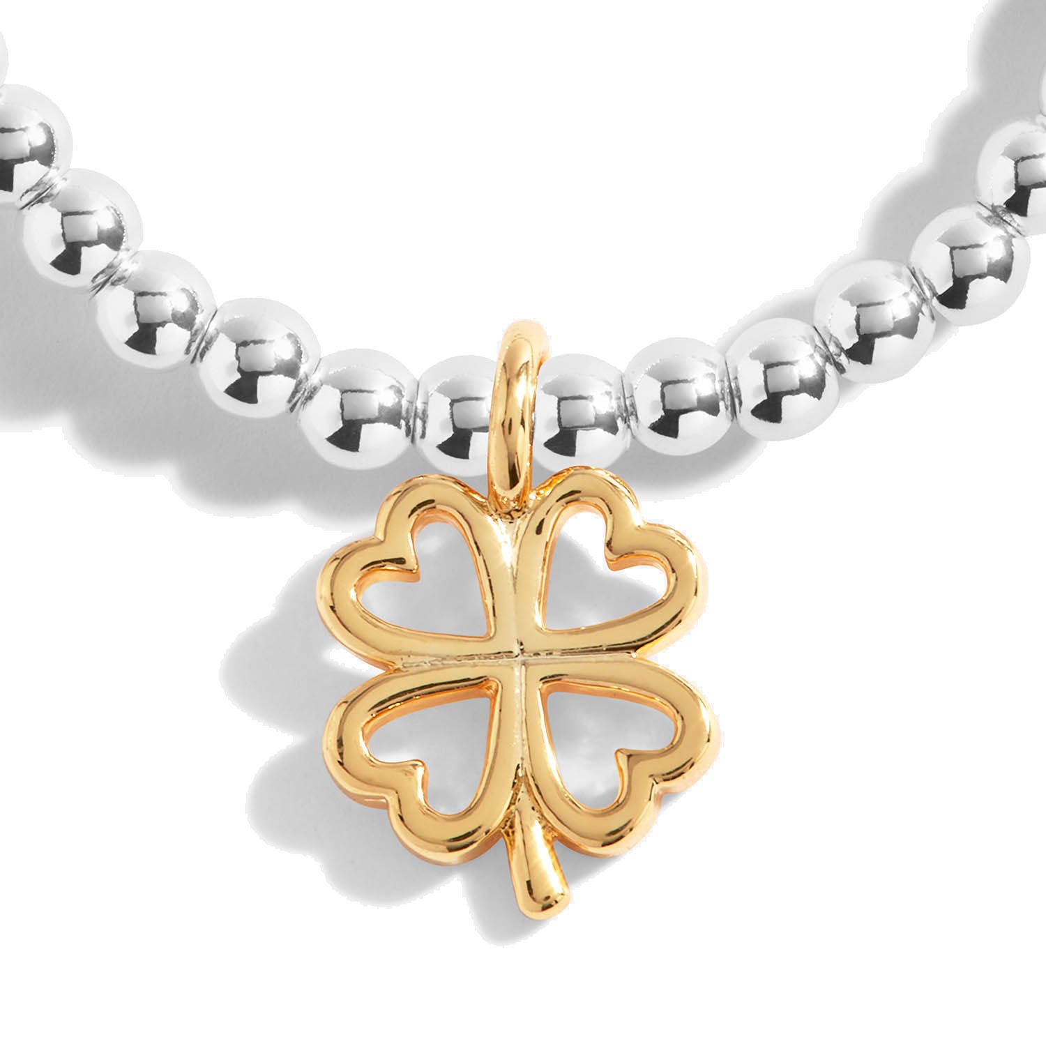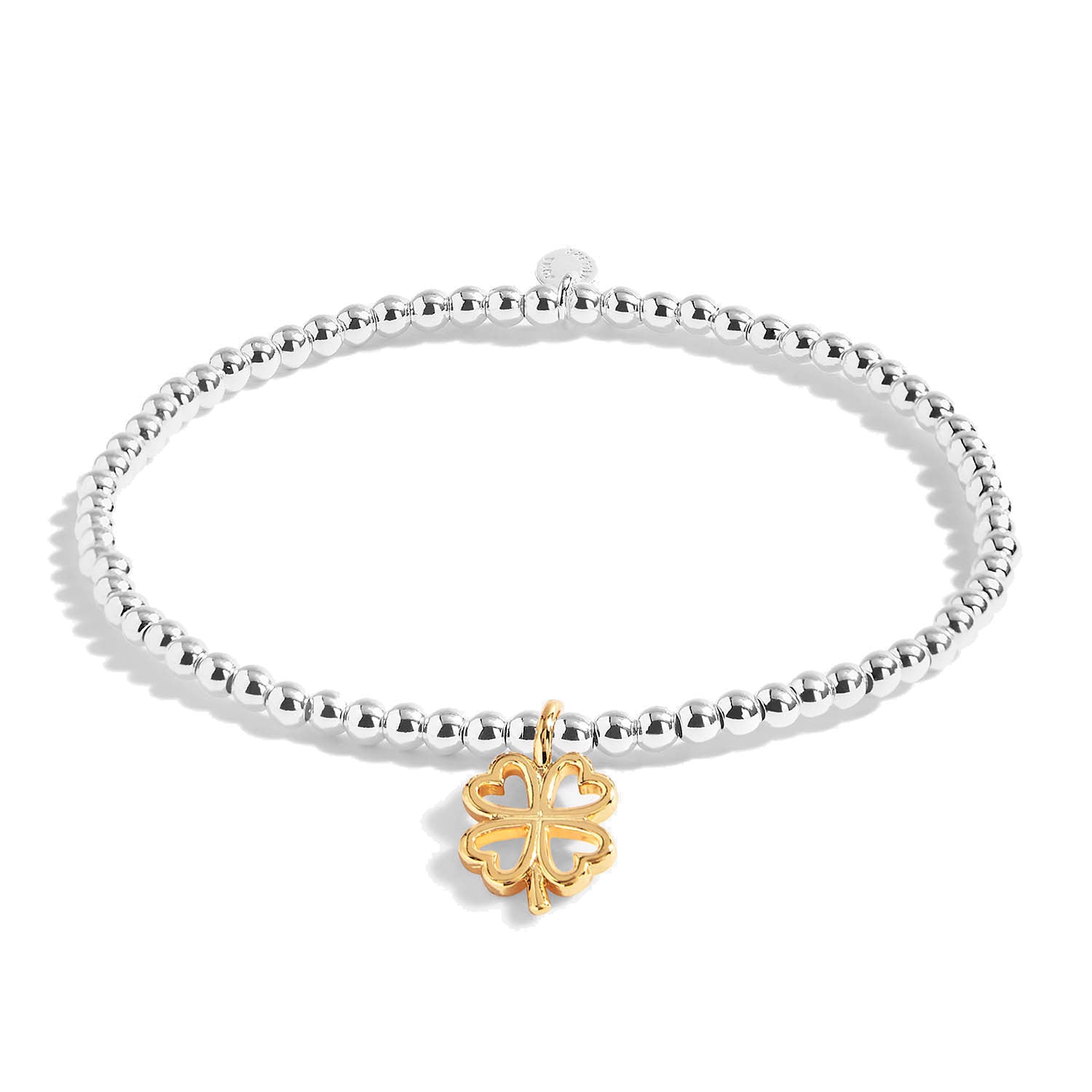 Featuring silver-plated beads with a stretch design, and a gold four-leaf clover charm.