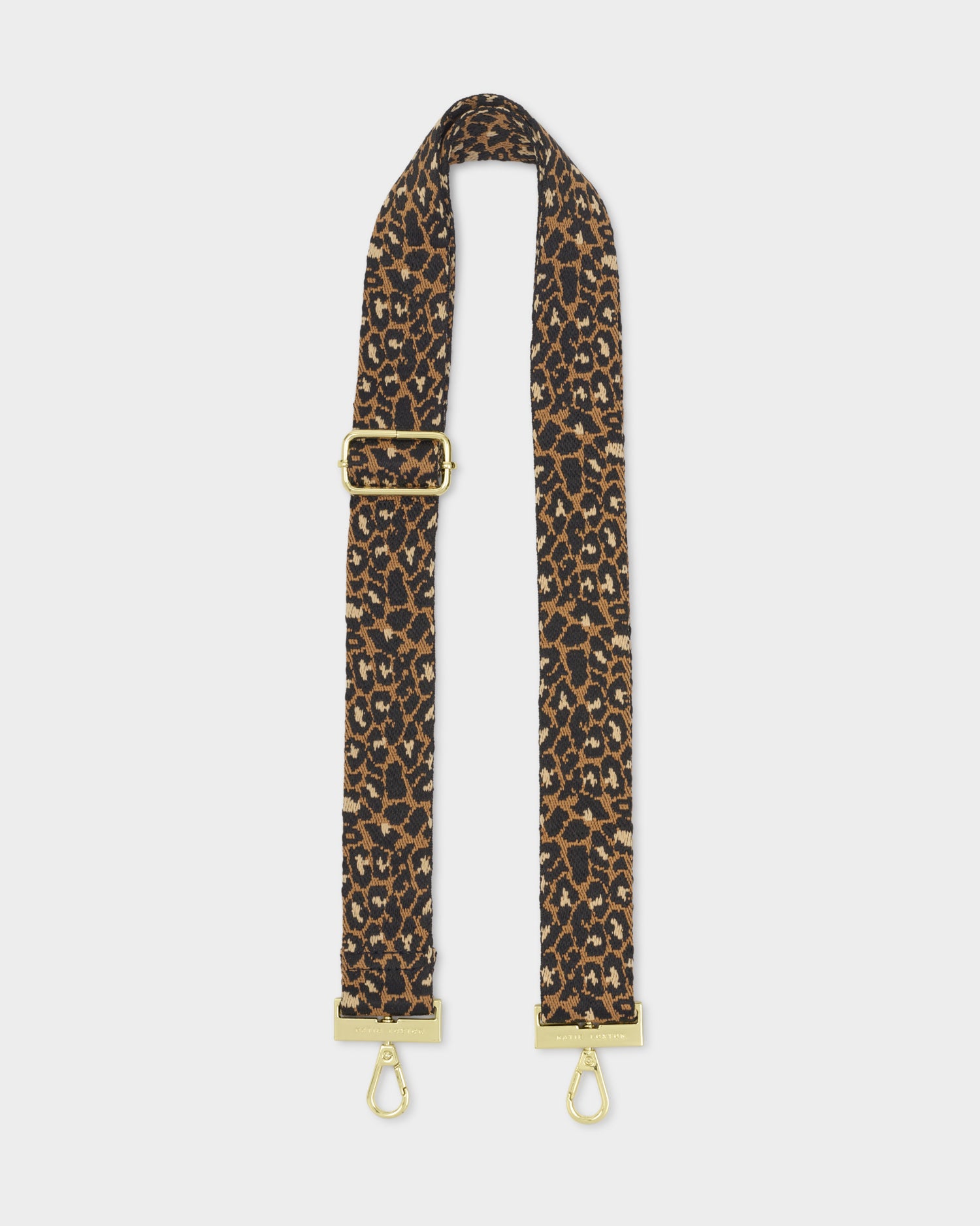 Add a touch of wild elegance to your accessories with the Katie Loxton Leopard Canvas Bag Strap in Taupe and Camel.
