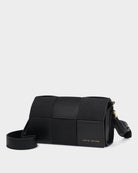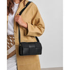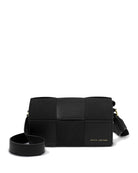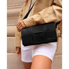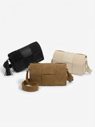 This standout accessory masterfully combines smooth vegan leather with a luxurious contrasting faux suede woven panel, creating a tactile aesthetic that captures the light and the eye alike.