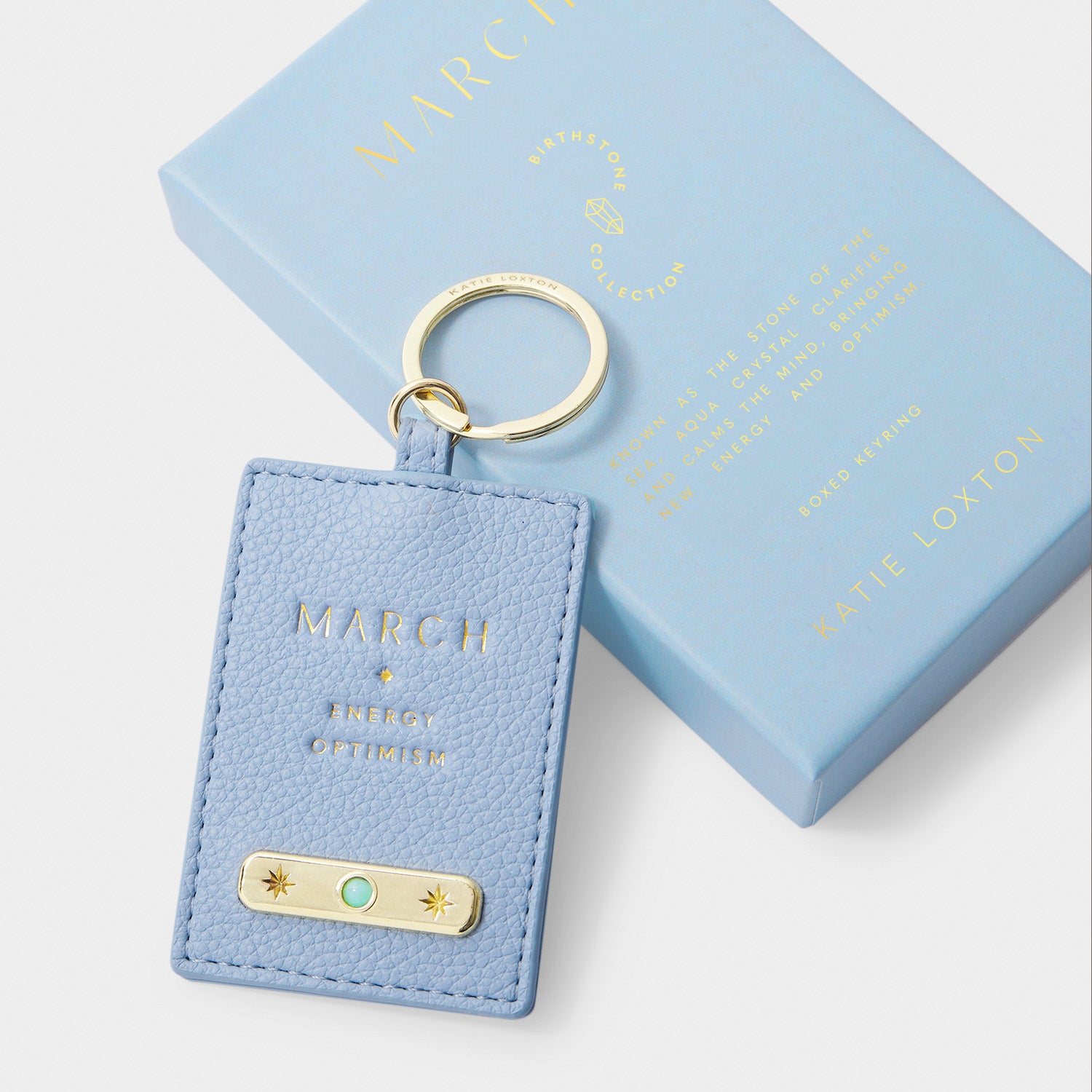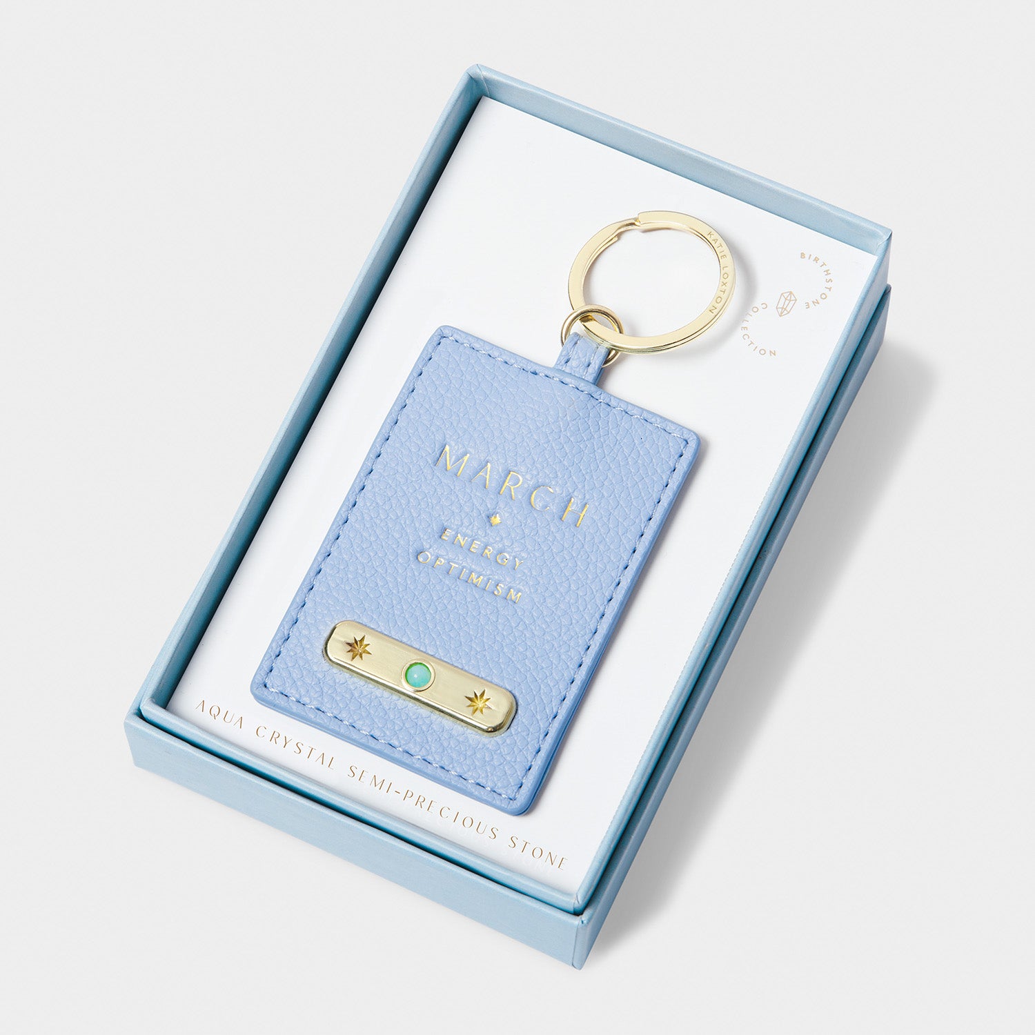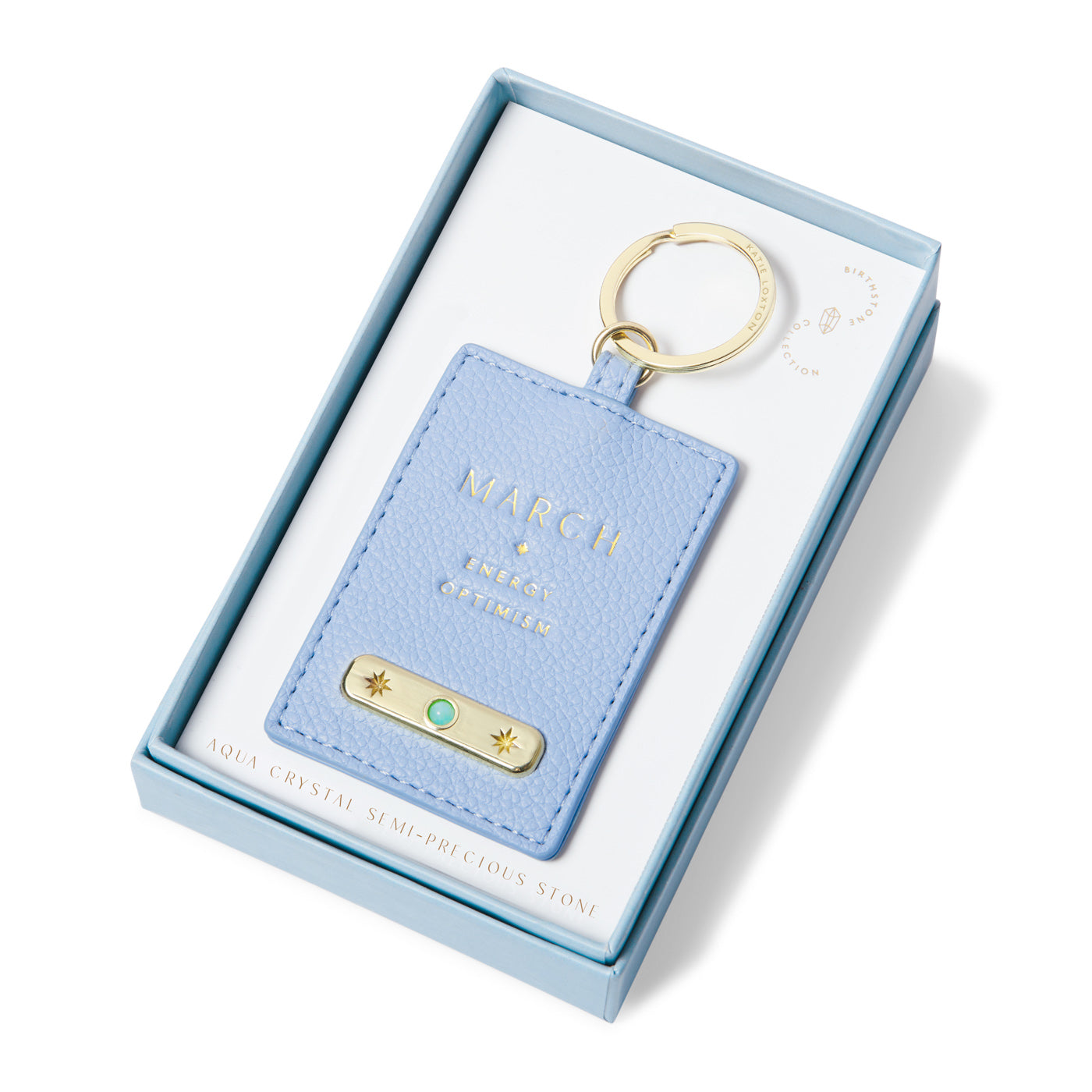 Crafted from smooth pebble vegan leather and adorned with luxe gold-tone hardware, this charming accessory is set with a genuine semi-precious Aqua Crystal — symbolising serenity, courage, and clarity. Designed to reflect the unique traits of those born in March, it makes a beautiful addition to any bag or key set.