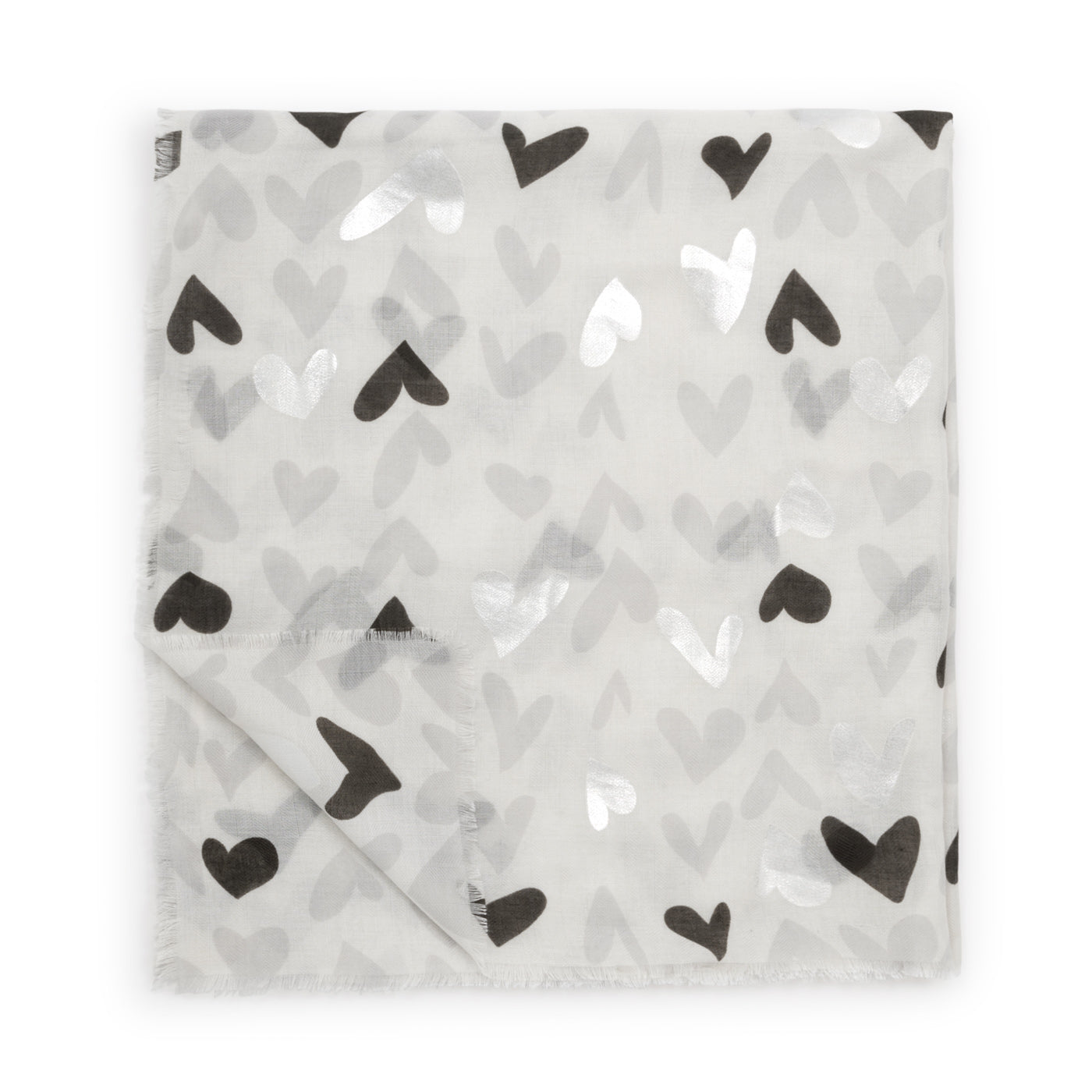 The Katie Loxton Abstract Heart Printed Foil Scarf in grey is the perfect blend of elegance and everyday style.