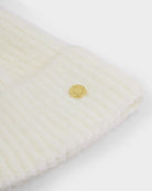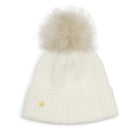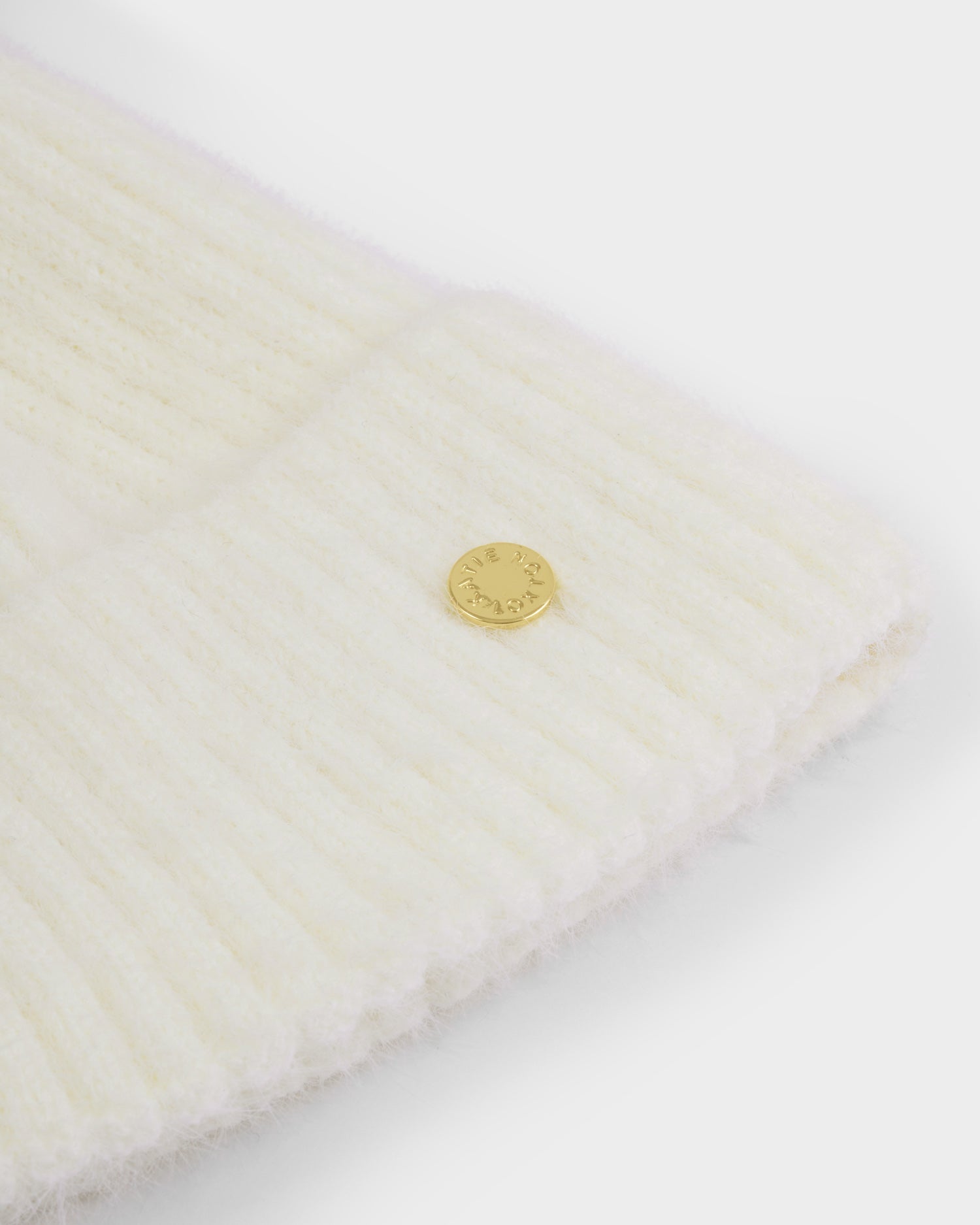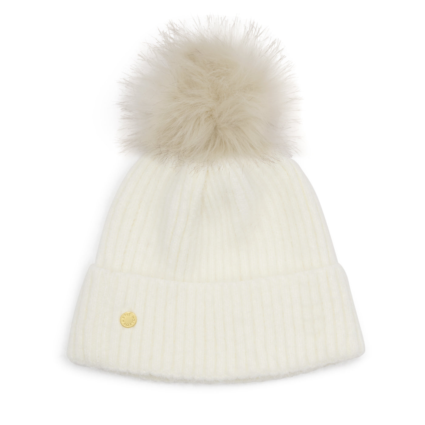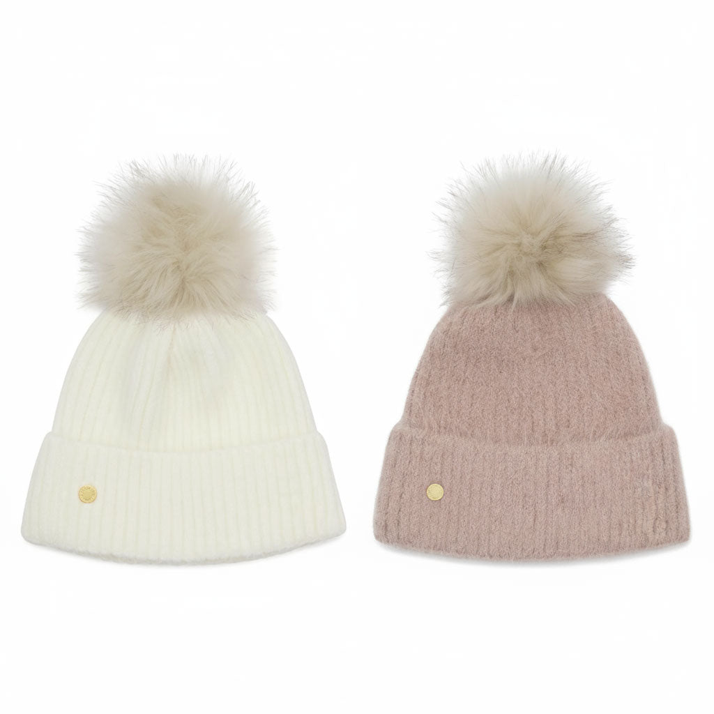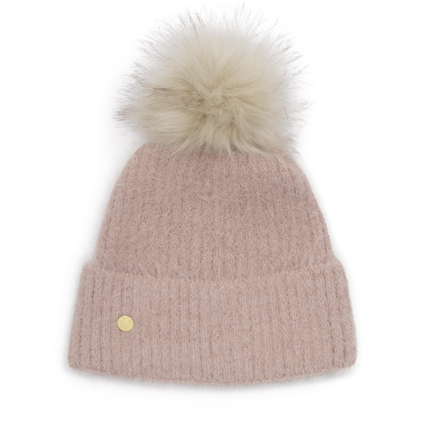 Crafted from soft, fluffy rib-knit material, it feels luxuriously warm while adding a fashionable touch to your winter wardrobe. Available in Creamy White or Dusty Pink, this snug hat is topped with a playful faux fur pom pom and finished with a gold-tone branded button for a hint of elegance.