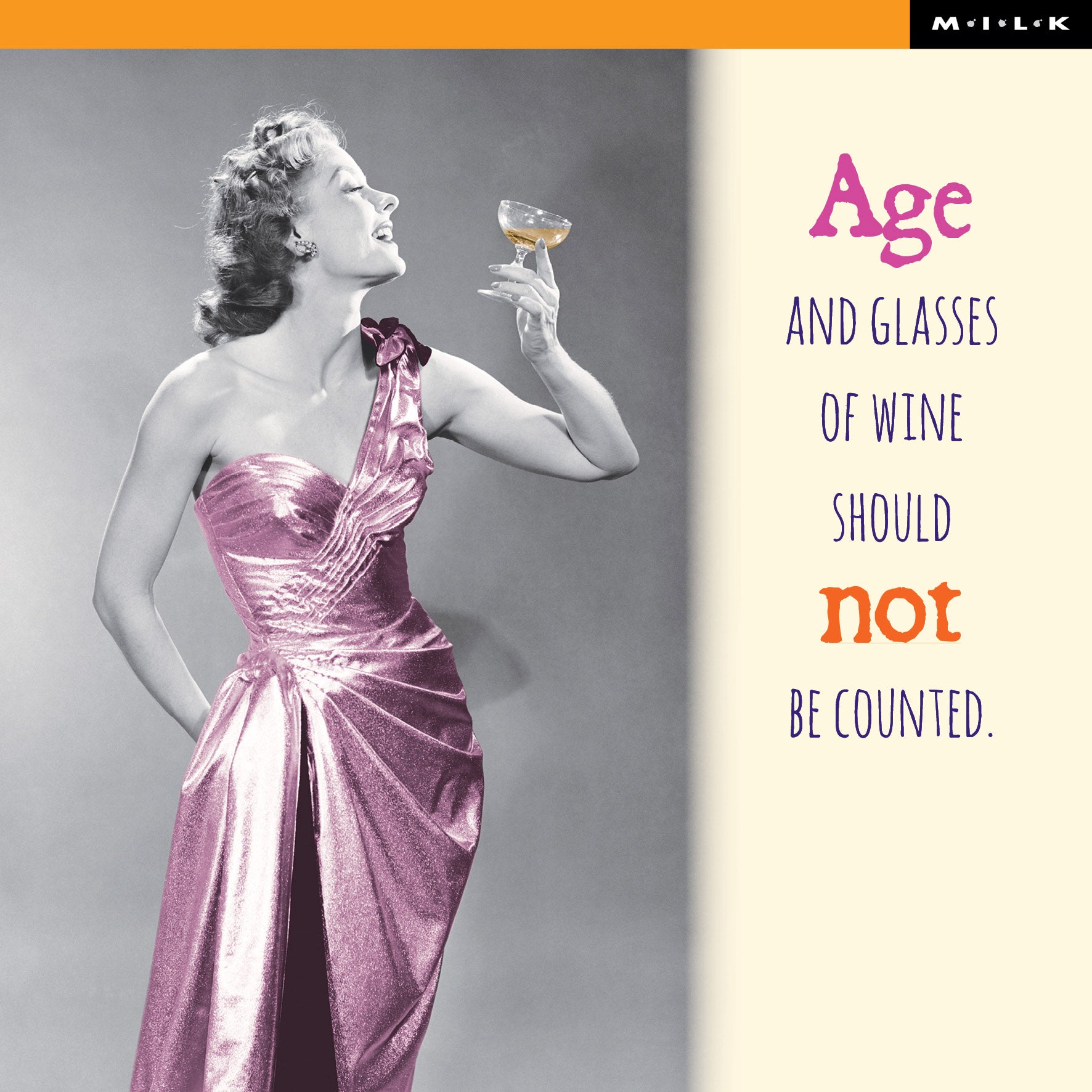 Sassy, stylish, and perfectly playful, this M.I.L.K. greeting card is made for the friend who embraces life without counting calories—or years. Featuring the witty line “Age and glasses of wine should not be counted” and a vintage-style photo of a glamorous lady in a cocktail dress, this card is a toast to confidence, celebration, and living fabulously.