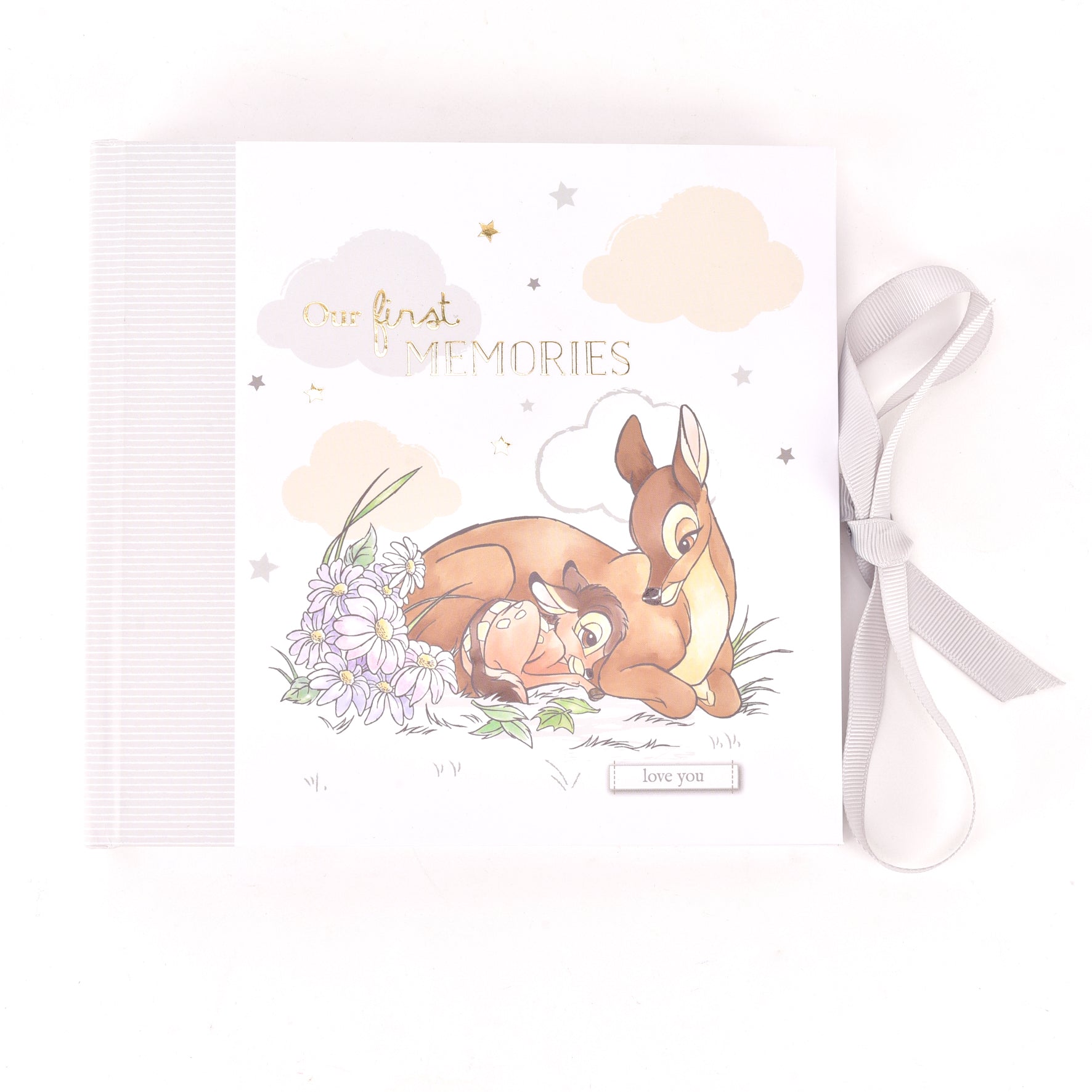 The album displays a beautifully printed image of Bambi and Thumper, complete with 'Our First Memories’ sentiment in gold glitter lettering. It holds space for fifty photographs, features a completable title page and is finished with a grey bow closure