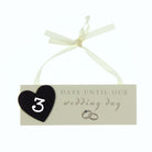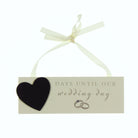 A beautiful countdown hanging plaque featuring 'days until our wedding day' titling with a black chalkboard heart for counting the days. It is finished with a white satin ribbon for hanging and set crystal intertwined ring design.