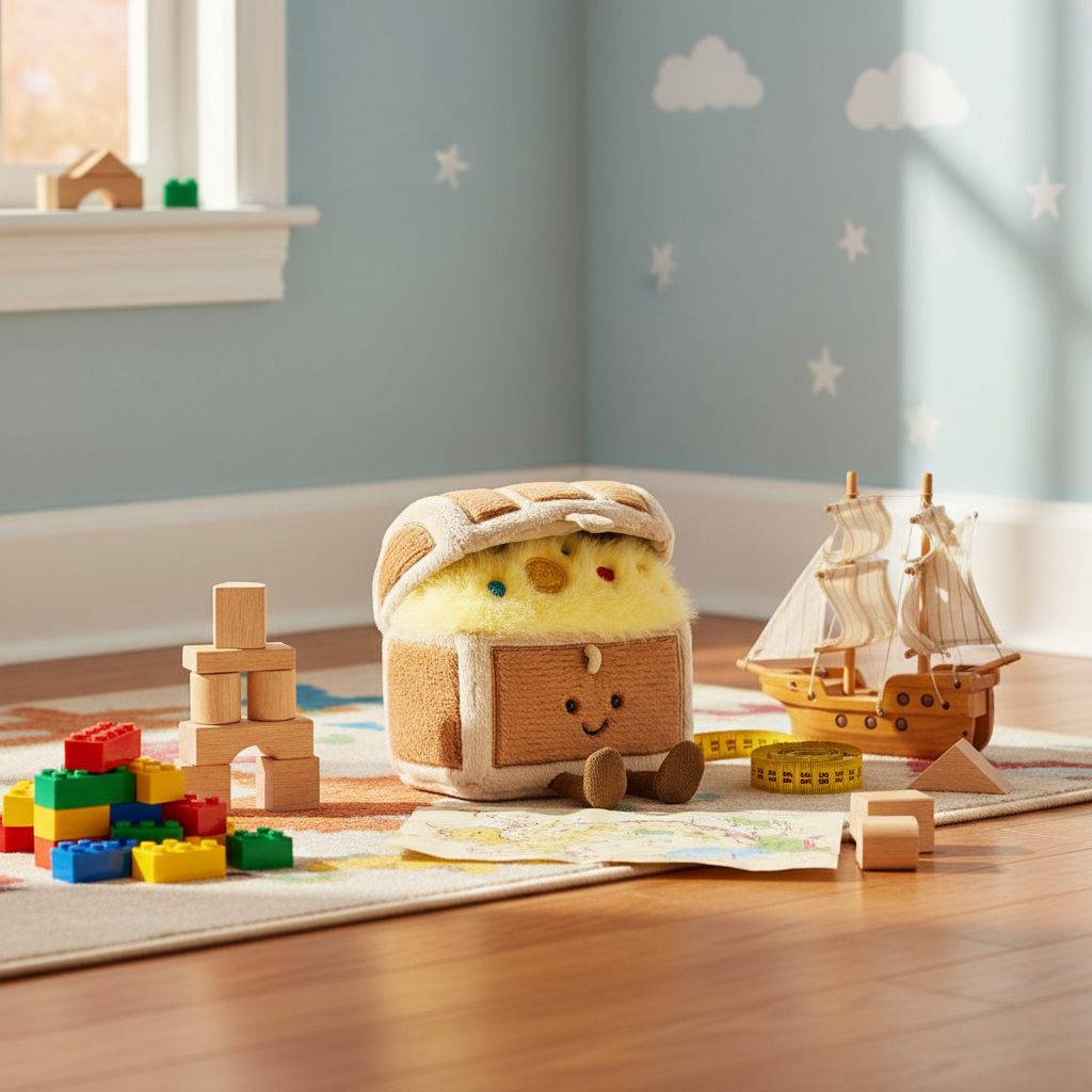 With a soft, huggable design and a twinkle in his hard eyes, this plush chest is brimming with stories of adventure, hidden gems, and daring voyages. Perfect for imaginative play, bedtime tales, or as a whimsical décor piece, he invites little explorers to join in on his exciting journeys. Soft, charming, and full of character, the Treasure Chest is a must-have for any aspiring first mate.