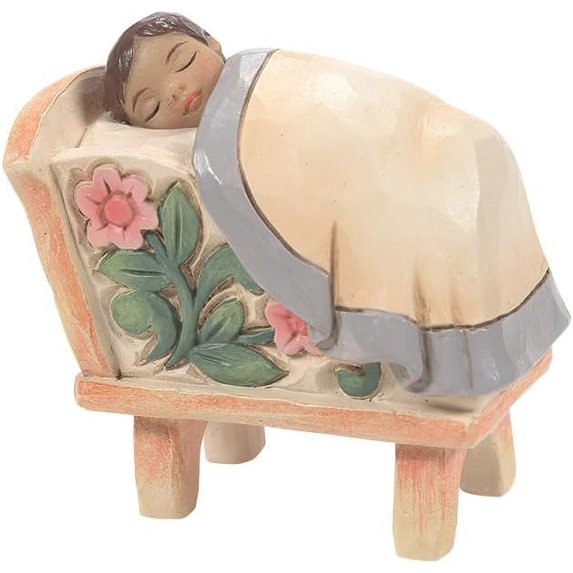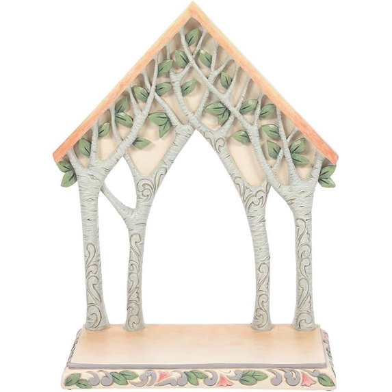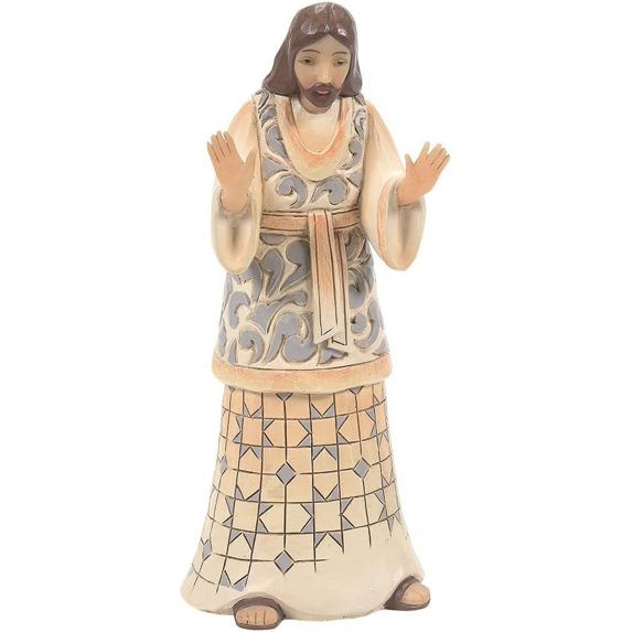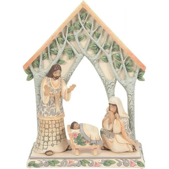 Jim Shore’s Holy Night Of Wonder is an elegant 8.5-inch resin nativity set comprising three figurines and a tree scene. This refined four-piece White Woodland collection portrays the Holy Family with graceful natural charm. Beneath a birch wood creche, Mary and Joseph tenderly admire baby Jesus, all clad in ornate white robes adorned with Jim Shore’s distinctive designs. The set pays tribute to nature’s subtle beauty through soft muted tones, intricate handcrafted detailing, and Shore’s signature artistic sophistication.