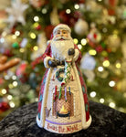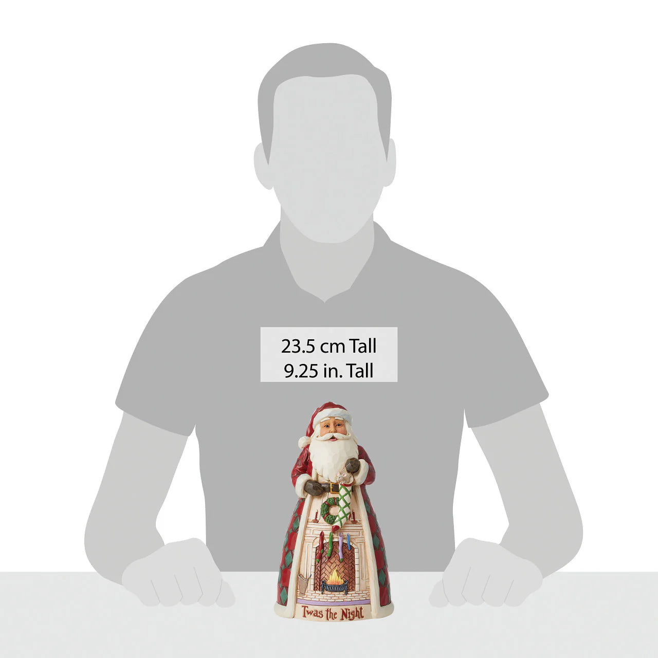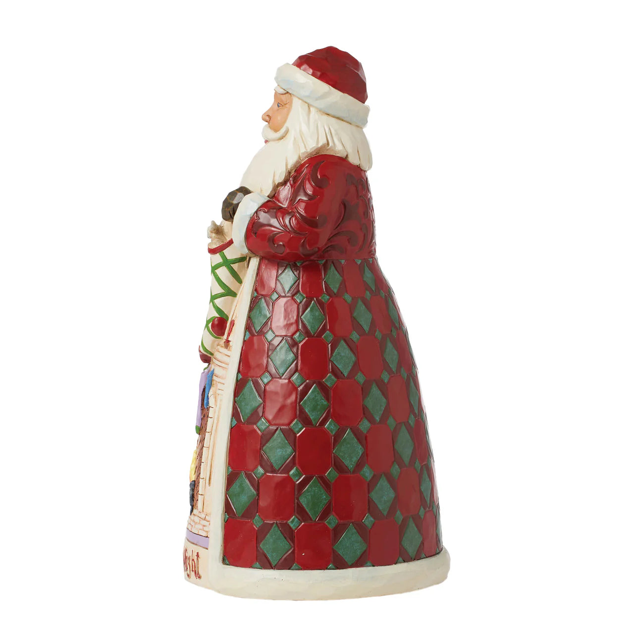 Jim Shore’s signature style brings warm nostalgia with classic themes, quilt patterns, and charming details. This hand-painted figurine delights with intricate design and careful craftsmanship. Santa, stocking in hand, reveals a snug scene on his cloak—a cozy home with a flickering fire and barely a creature stirring, save for a curious little mouse peeking out from beneath his gloved hand. A whimsical and heartwarming piece that captures the magic of the season!
