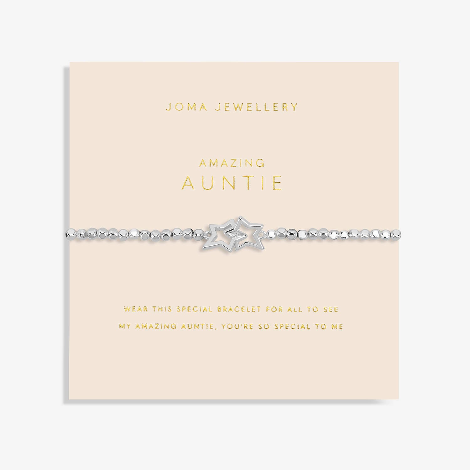 This beautiful bracelet features a silver-plated hammered bead design with double interlocked star-shaped charms. Complete with a pretty card that has been stamped with the sentiment 'Amazing Auntie' and a sweet poem.