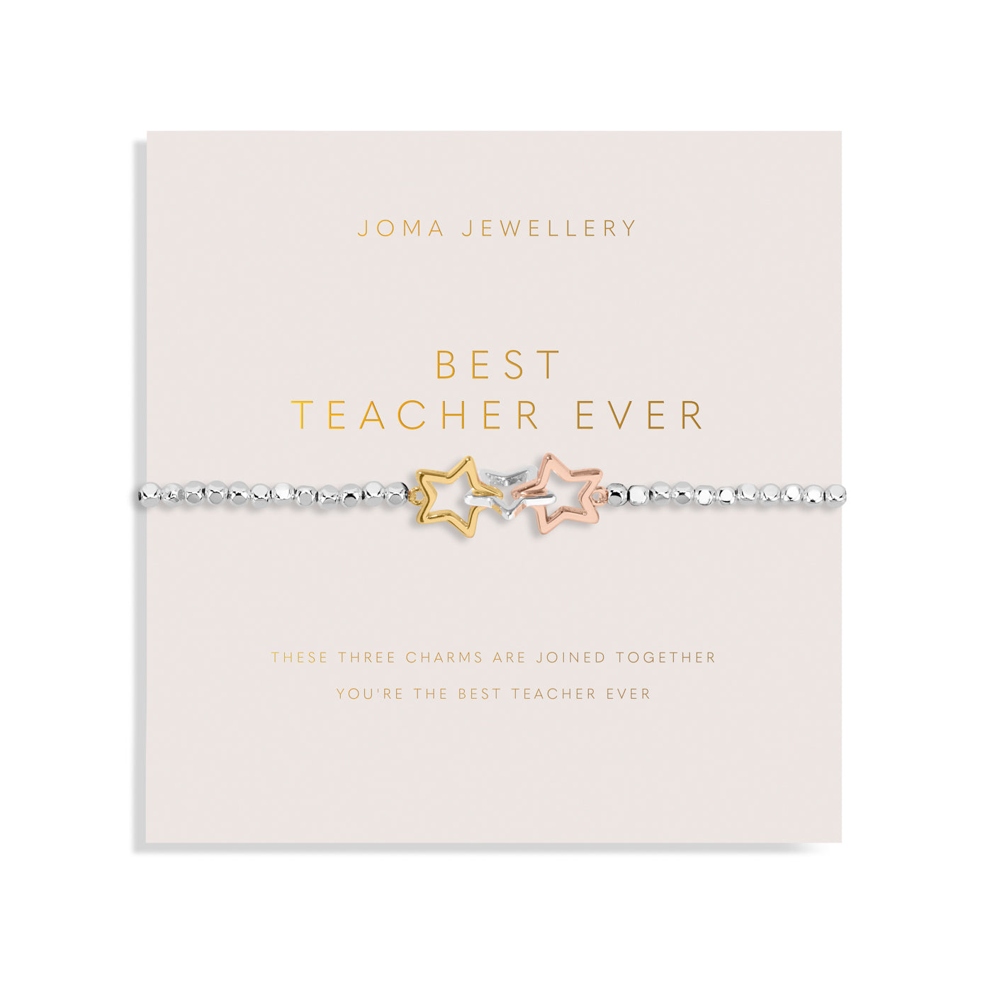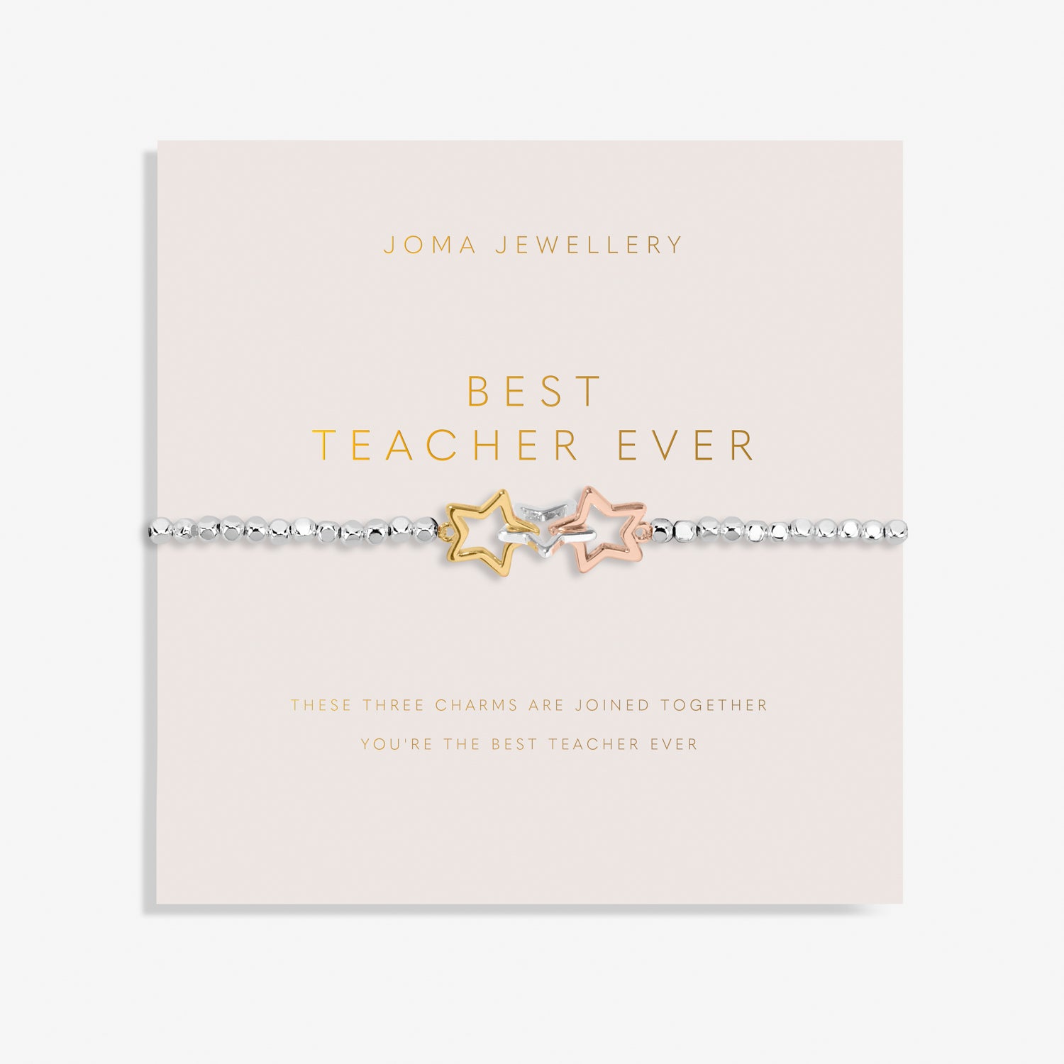 Part of the elegant Forever Yours collection, this thoughtful bracelet features a silver-plated hammered bead design with a trio of linked star charms, symbolizing gratitude, inspiration, and guidance. Beautifully presented on a blush sentiment card with a heartfelt poem, it's the perfect way to celebrate a truly special teacher.