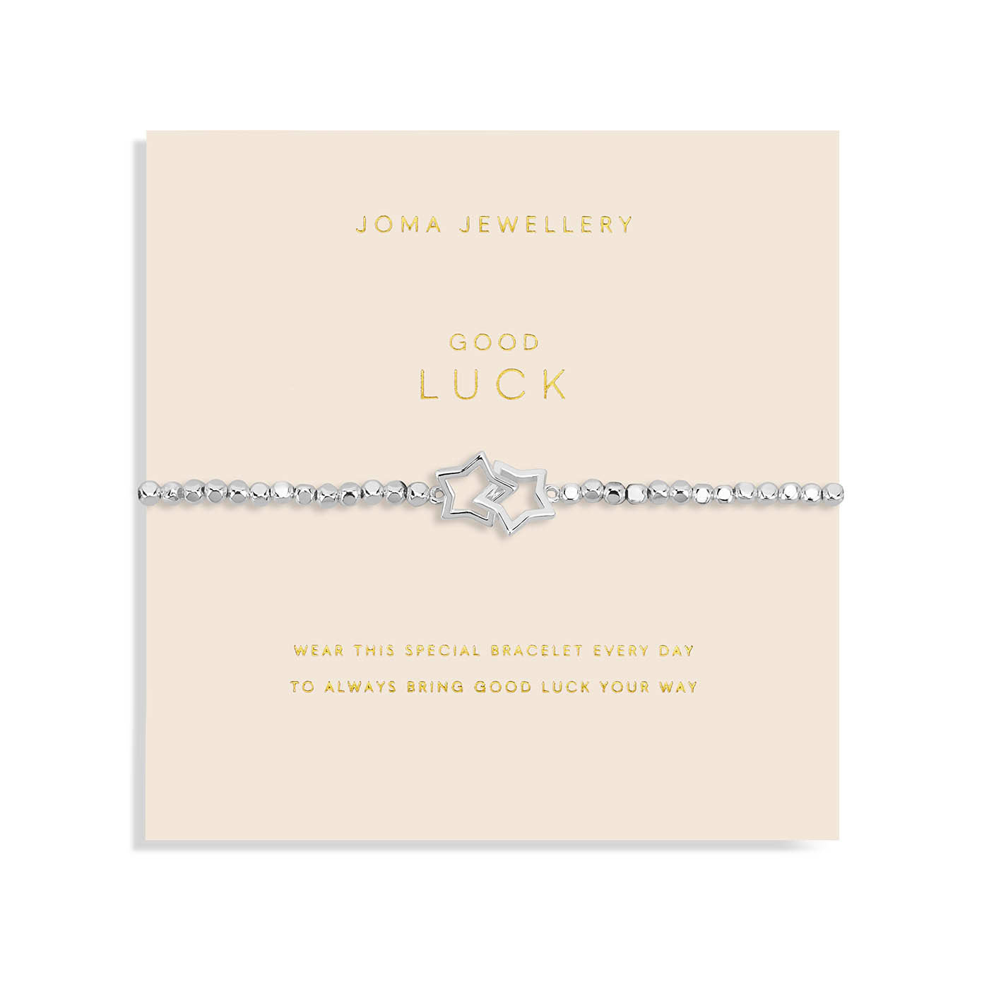 This beautiful bracelet features a silver-plated hammered bead design with double interlocked star-shaped charms. Complete with a pretty card that has been stamped with the sentiment 'Good Luck' and a sweet poem.