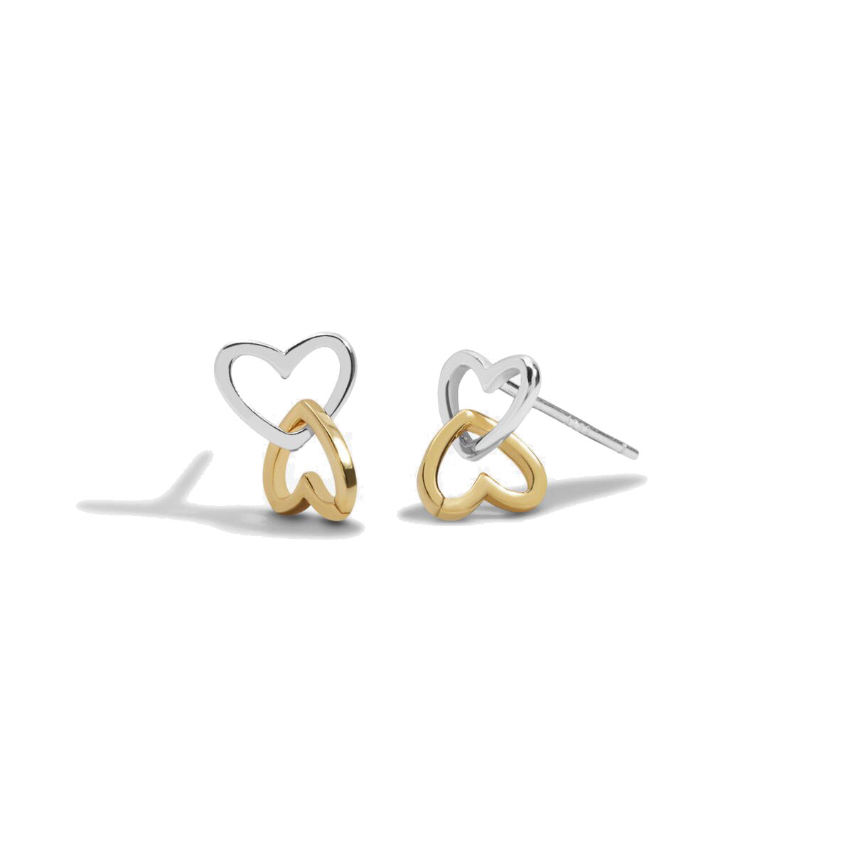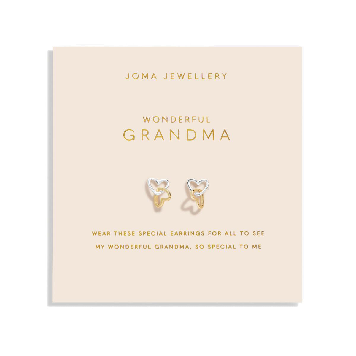 Featuring shimmering drop studs adorned with two interlocked heart charms in silver plating and gold plating, they exude elegance and sentimentality. Accompanied by a pretty pink card with the heartfelt words "Wear these special earrings for all to see, my wonderful Grandma, so special to me," this pair is the perfect style to gift from the heart.