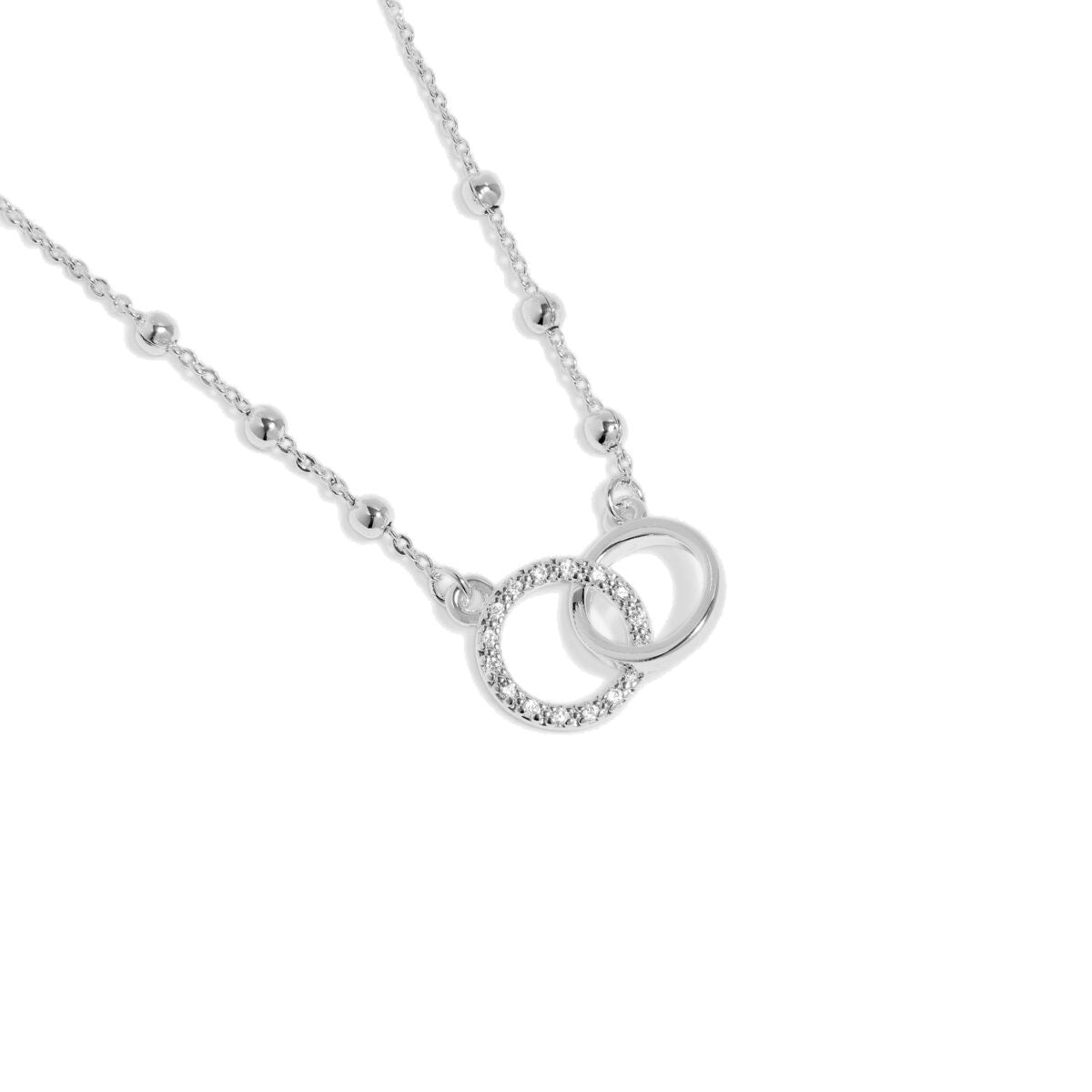 Crafted with a shining silver-plated beaded clasp chain, this elegant necklace features two interlocked circles adorned with sparkling pavé detail, symbolising the lasting connection of family. Presented on a blush card this 46cm necklace with a 5cm extender is a meaningful keepsake, perfect for showing someone just how cherished they are.