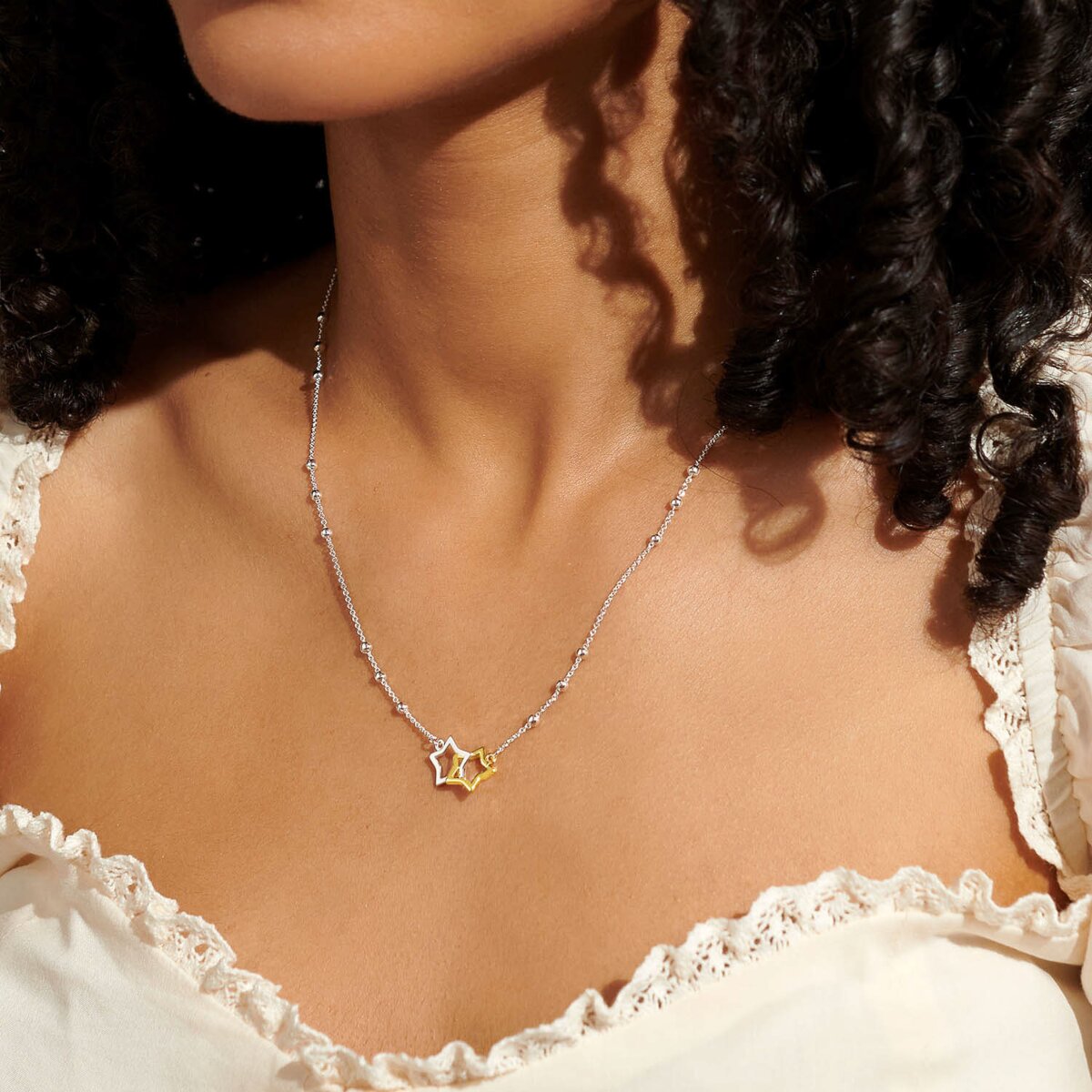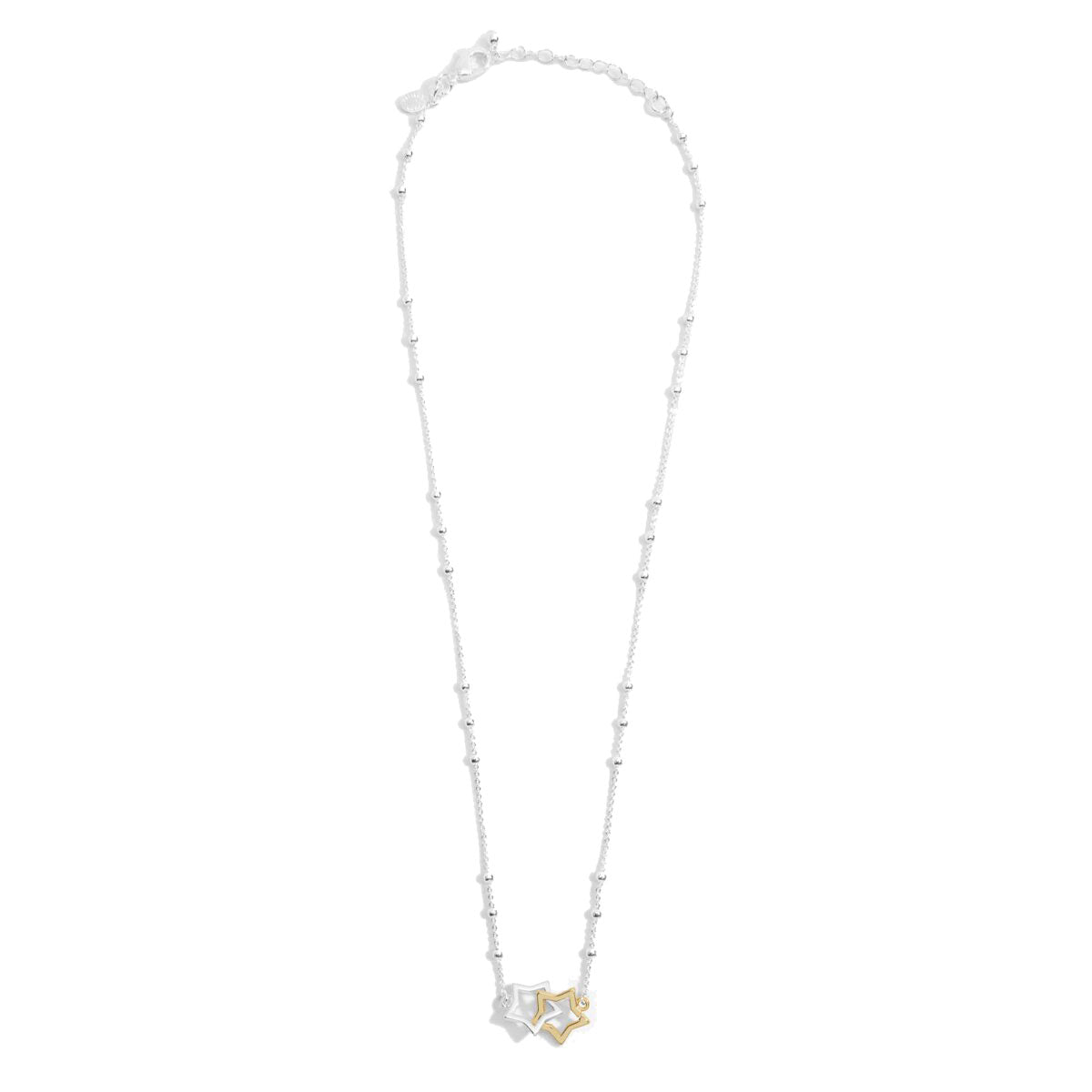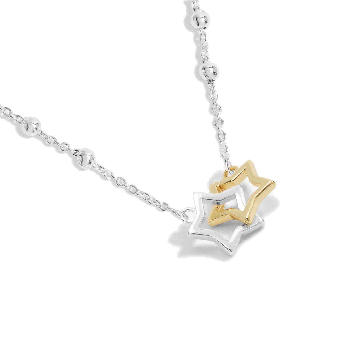 Crafted to be gifted for all of life's celebrations, this necklace features two shine-bright stars - one in silver plating and one in gold plating - interlocked at the heart of a classic clasp chain. The combination of silver and gold adds versatility and elegance to any ensemble. Presented on a pretty blush pink card with a special celebration poem reading "This little necklace is just to say, it's time to celebrate, hip hip hooray!" it's a heartfelt way to mark a special occasion.