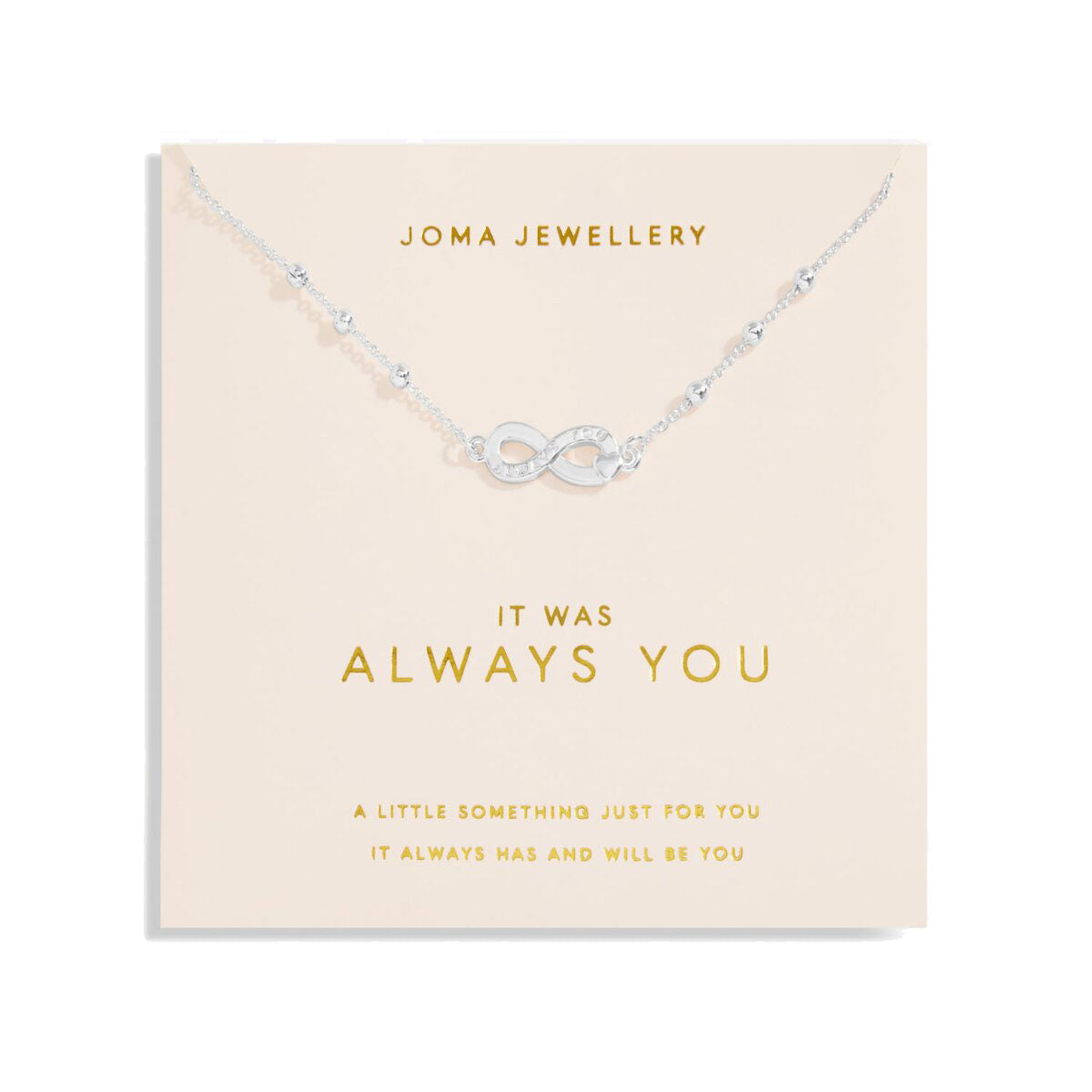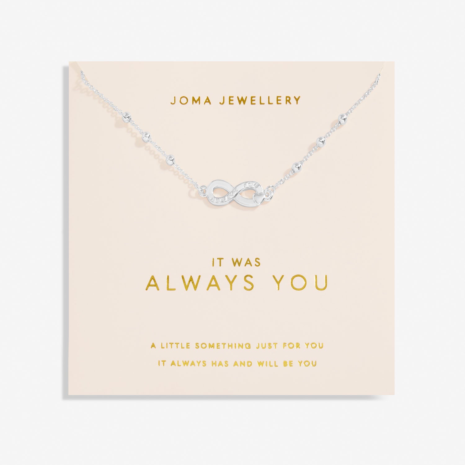 Crafted with care, this necklace pairs a classic silver-plated clasp chain with an 'always you' engraved infinity charm, symbolizing the eternal bond you share. Wrapped around a blush pink card with the sentiment "A little something just for you, it always has and will be you," it's a heartfelt expression of love and commitment.