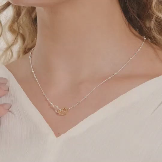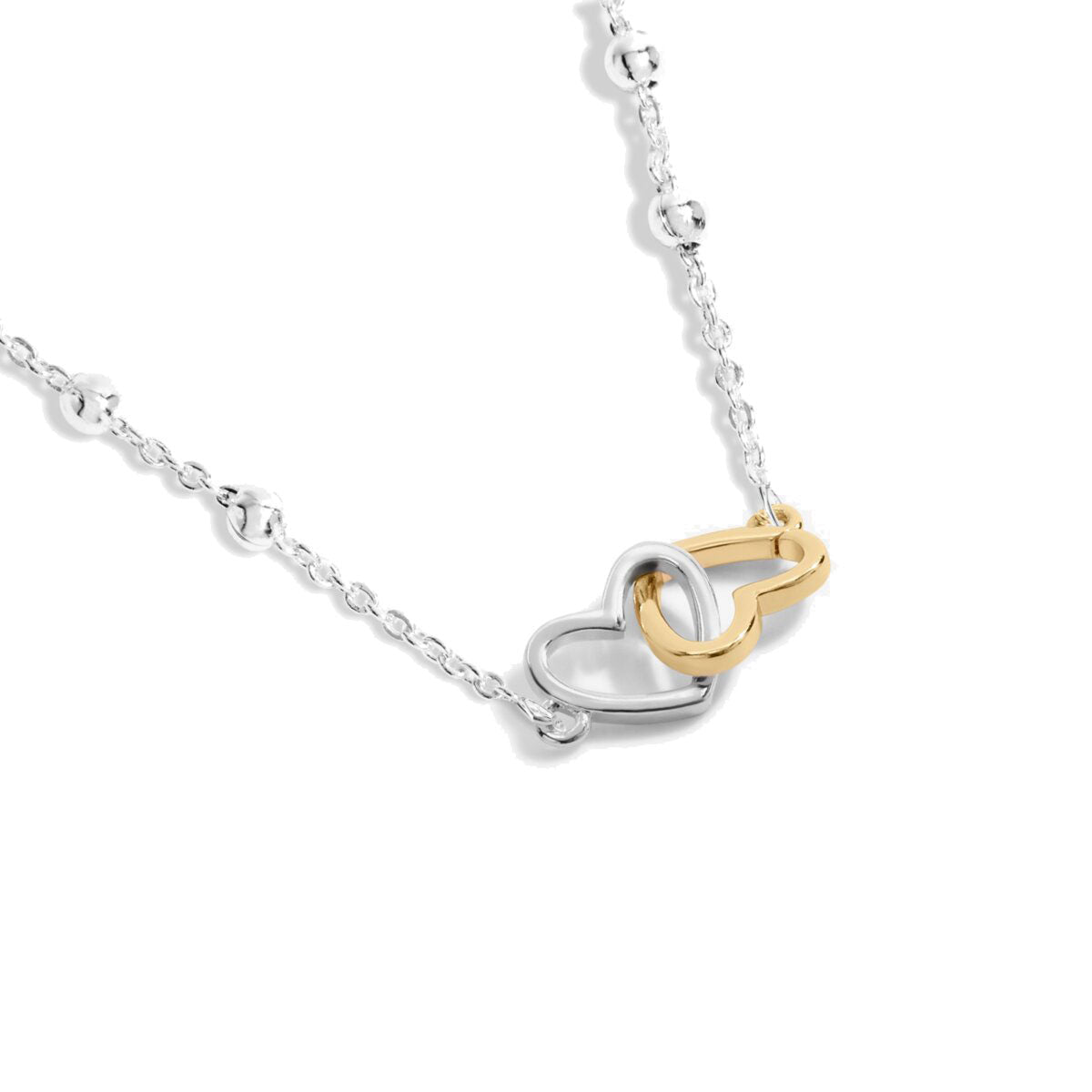 This beautiful necklace features a shining silver-plated spacer bead chain adorned with two interlocked hearts in silver and gold plating, symbolising a bond that lasts a lifetime. Presented on a blush card with a heartfelt message, this 46cm necklace with a 5cm extender is an elegant keepsake, perfect for showing appreciation for someone remarkable.