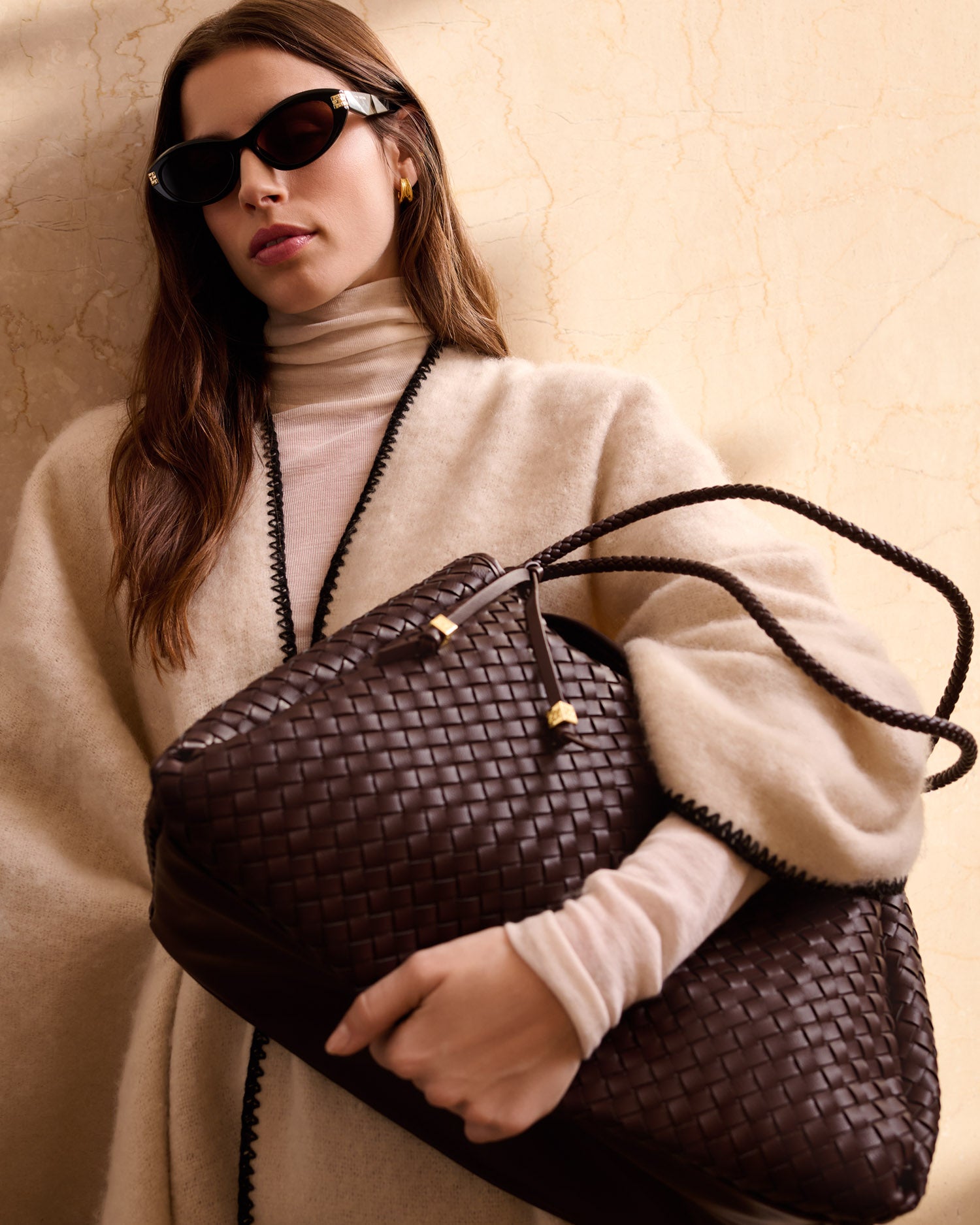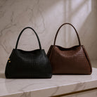 Crafted from beautifully soft woven vegan leather, this spacious bag offers effortless versatility for workdays, weekends and everything in between. Its oversized silhouette is both practical and elegant, while gold-tone accents and a signature branded charm elevate its premium appeal. The secure magnetic closure and internal zip pocket keep your essentials safe and organised, making it the perfect balance of style and function.